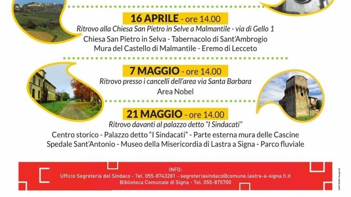 Il 16 aprile le passeggiate continuano nel territorio di Lastra a Signa, con ritrovo fissato alle 14 alla chiesa San Pietro in Selve a Malmantile in via di Gello, per poi proseguire verso il tabernacolo di Sant’Ambrogio, le mura del Castello di Malmantile e l’Eremo di Lecceto.