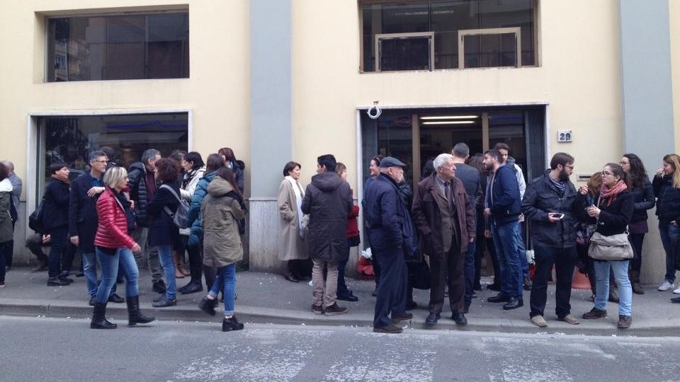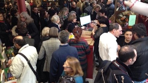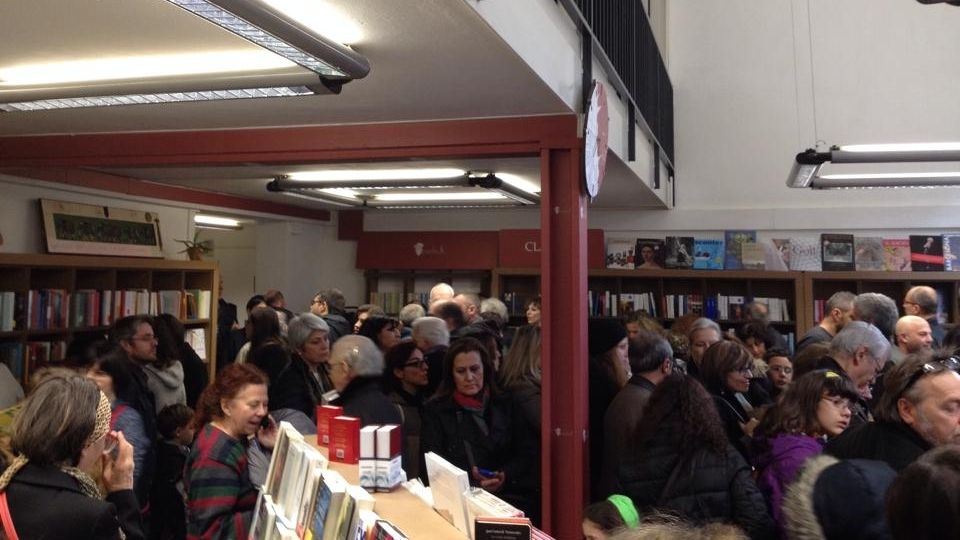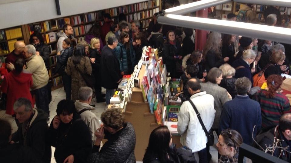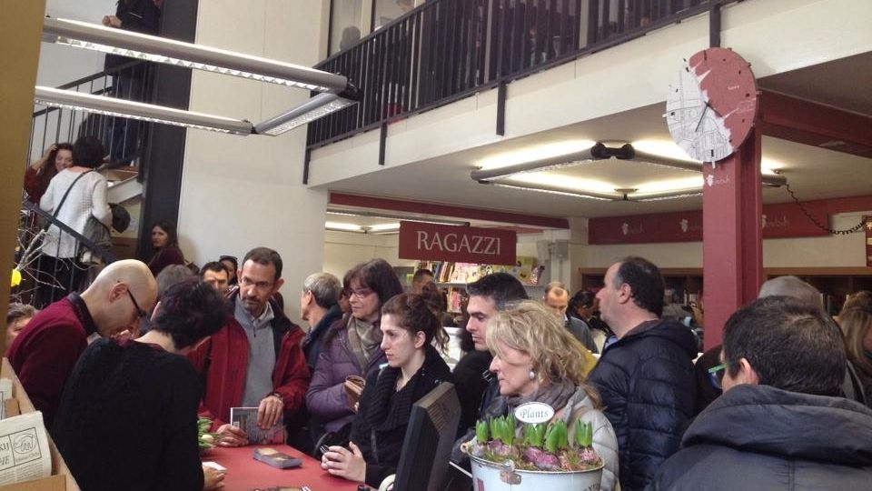 Non si riesce quasi ad entrare dalla folla che si stringe davanti alla porta della nuova libreria Marabuk. E' la libreria completamente gestita dagli ex dipendenti Edison, che hanno deciso di rimettersi in gioco con questa nuova impresa.