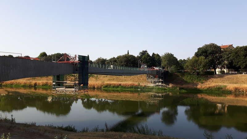 I lavori procedono come da programma. Dal 26 giugno, data in cui la passerella è stata chiusa, sono stati effettuati interventi di consolidamento delle mensole originali su cui poggerà la nuova campata. La trave, realizzata in carpenteria e già arrivata in cantiere a pezzi, è stata assemblata sul posto e ha le stesse dimensioni e lo stesso profilo della vecchia, ma è più leggera perché realizzata in acciaio. Dopo sarà rivestita in pannelli di calcestruzzo, opportunamente verniciati in modo da avere un aspetto simile a quello dell’attuale passerella.