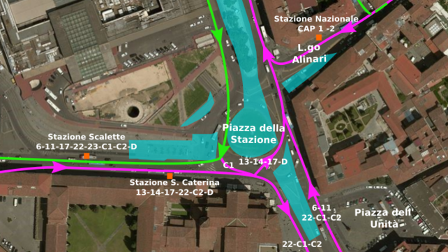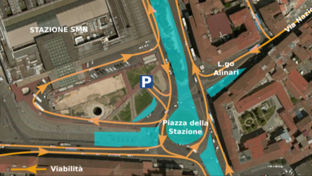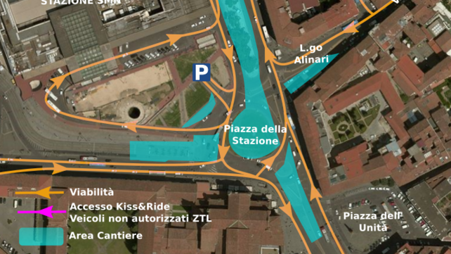 Per realizzare i binari e gli scambi nell’area della rotonda della piazza sarà infatti interrotto il flusso rotatorio, in particolare quello dei veicoli in arrivo da via Nazionale-largo Alinari che non potranno più raggiungere direttamente le scalette e via Santa Caterina da Siena.