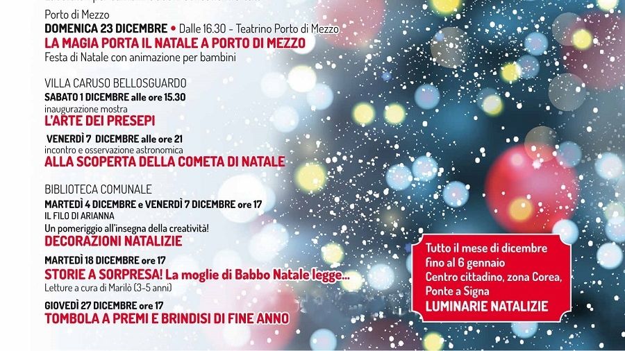 Alla biblioteca comunale fra le iniziative dedicate al Natale si terrà martedì 4 e 7 dicembre alle 17 un pomeriggio all’insegna del fai da te e della creatività con il Filo di Arianna dedicato alle decorazioni natalizie, martedì 18 dicembre alle 17 le Storie sorpresa! La moglie di Babbo Natale legge..(per i piccoli dai 3 ai 6 anni) e infine la Tombola a premi e brindisi di fine anno giovedì 27 dicembre alle 17.