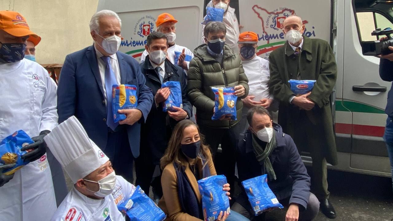 Nel capoluogo toscano la consegna dei 500 chili di pasta necessari a preparare il pranzo, poi elaborato dagli chef fiorentini guidati da Massimiliano Catizzone, è avvenuta alla presenza del presidente della Regione Toscana Eugenio Giani, degli assessori del Comune di Firenze al welfare Sara Funaro e alle attività produttive Federico Gianassi, oltre che dei presidenti di Fipe Confcommercio Toscana Aldo Cursano e del Dipartimento Solidarietà Emergenze della FIC Toscana Gian Carlo Gliceri e del direttore di Confcommercio Toscana Franco Marinoni. A riceverli, il presidente della Fondazione Solidarietà Caritas Firenze Vincenzo Lucchetti.