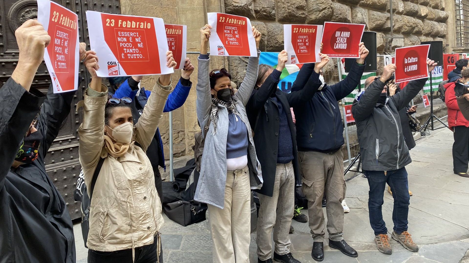 Protesta dei lavoratori dello spettacolo questa mattina, martedì 23 febbraio 2021, a Firenze, con un presidio-flash mob in via Cavour, davanti alla Prefettura, con i sindacati Slc Cgil, Fistel Cisl e Uilcom Uil per denunciare lo stato di grave crisi del settore e per chiedere ammortizzatori, riapertura delle sale in sicurezza e un rilancio del comparto.