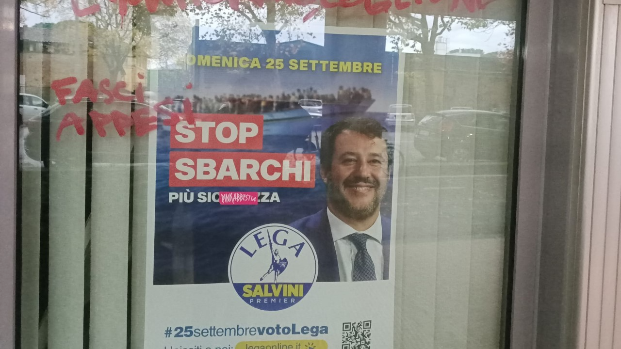 "Fasci appesi". E' una delle scritte rosse con cui è stata imbrattata la vetrina della sede della Lega a Firenze.