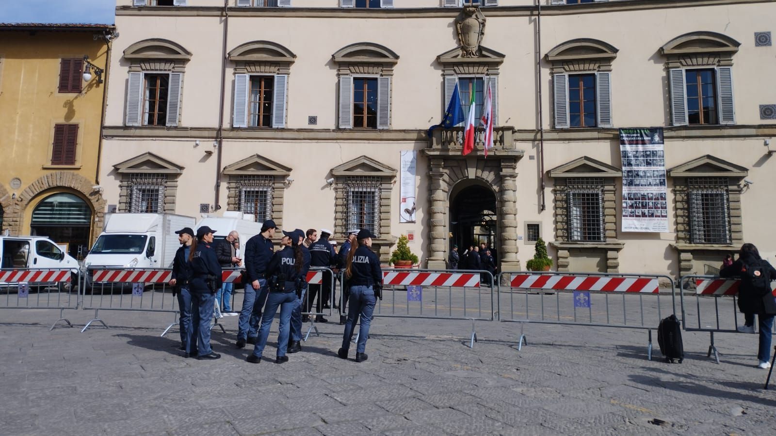 Piazza Duomo blindata per l'arrivo di Meloni, con l'ingresso del palazzo regionale transennato e forze dell'ordine a presidiare la piazza. Una piccola folla di curiosi si è riunita oltre le transenne.