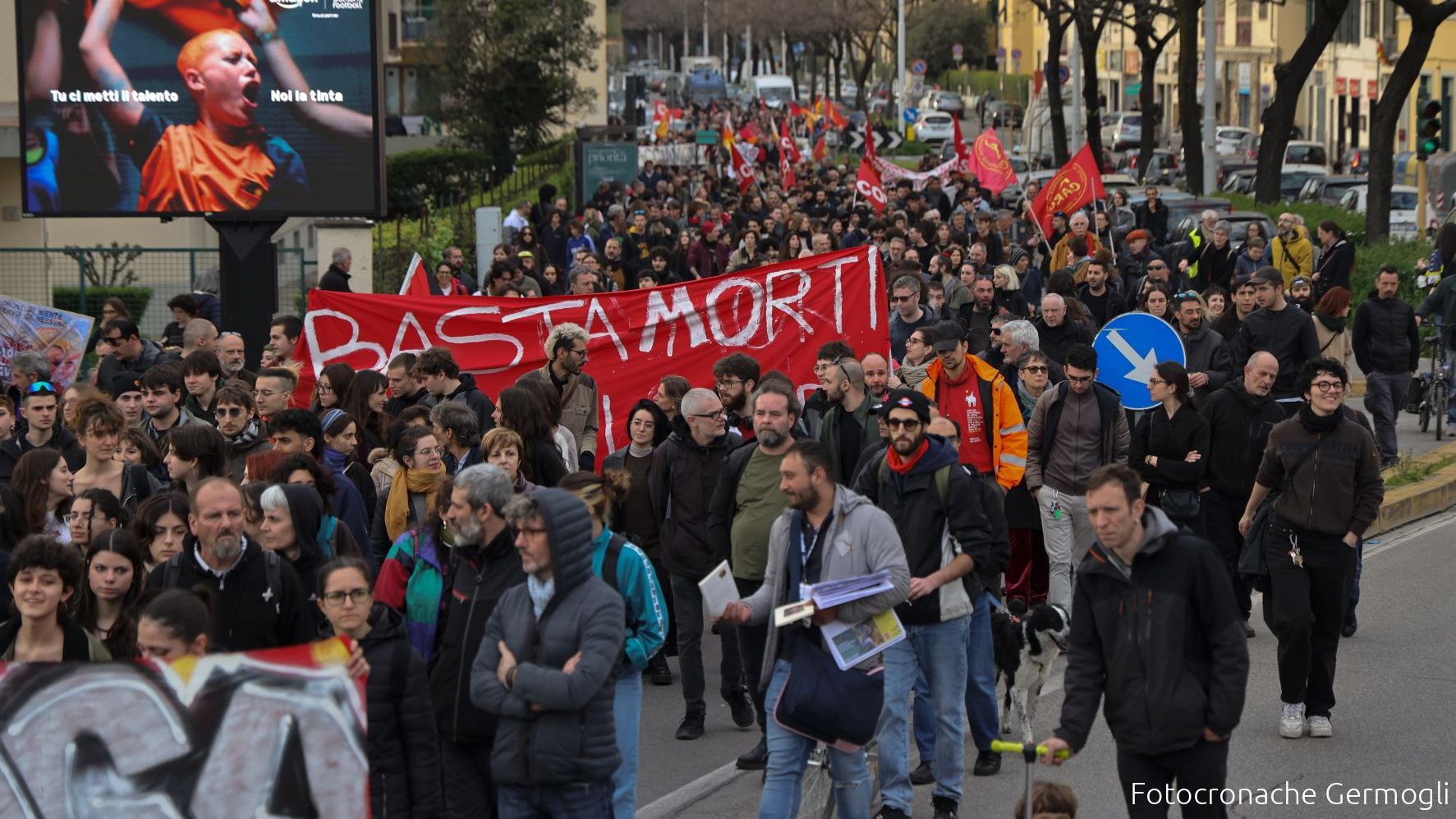 "Questa manifestazione è stata indetta dall'assemblea 16 febbraio, che è nata letteralmente su un marciapiede, due giorni dopo la strage operaia. Si sono trovati tanti cittadini e cittadine, realtà sociali, politiche, pieni di dolore e rabbia - dice al microfono uno degli organizzatori del corteo - Fondamentalmente abbiamo detto che questa volta non avresarebbe bbe finita lì, che avremmo tenuto una porta aperta al nostro dolore e alla nostra rabbia, che i minuti di silenzio e dire mai più morti non ci basta più. Ci siamo detti che dobbiamo rompere le catene dello sfruttamento. Abbiamo pensato che un parco pubblico dove è avvenuta la strage, al posto del centro commerciale, sia la risposta migliore per continuare a tenere aperta questa porta, perché la memoria della strage rimanga nel tempo, e diventi centrale questo parco per le vite del quartiere e dei suoi abitanti ma anche per la lotta contro lo sfruttamento. Ci fa piacere non essere soli, ma vedere una moltitudine di cittadine e cittadini con noi, ci sono realtà sociali, sindacali e politiche che interverranno. Vogliamo parlare di condizioni di lavoro, appalti, lavoro nero, controlli che amcnano, di lavori interinali, di precariato. E di questo quartiere che vede la più alta concentrazione di centri commerciali. È un territorio in cui interi pezzi vengono privatizzati, sfruttati per il profitto privato e tolti agli abitanti. Parleremo della risposta che sta dando il Comune che non va nella direzione giusta".