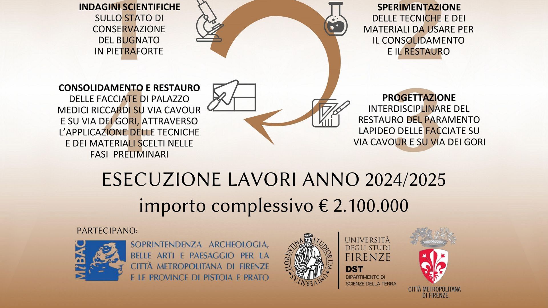 Con una durata prevista di 365 giorni, l’intervento rappresenta la fase finale di un protocollo di collaborazione fra Soprintendenza Archeologia Belle Arti e Paesaggio di Firenze Pistoia e Prato, Dipartimento Scienze della Terra dell’Università degli Studi di Firenze e Direzione Edilizia della Città Metropolitana di Firenze ed è frutto degli esiti del Cantiere Sperimentale per le indagini sullo stato di conservazione del bugnato lapideo del palazzo, condotto negli anni 2021 e 2022.