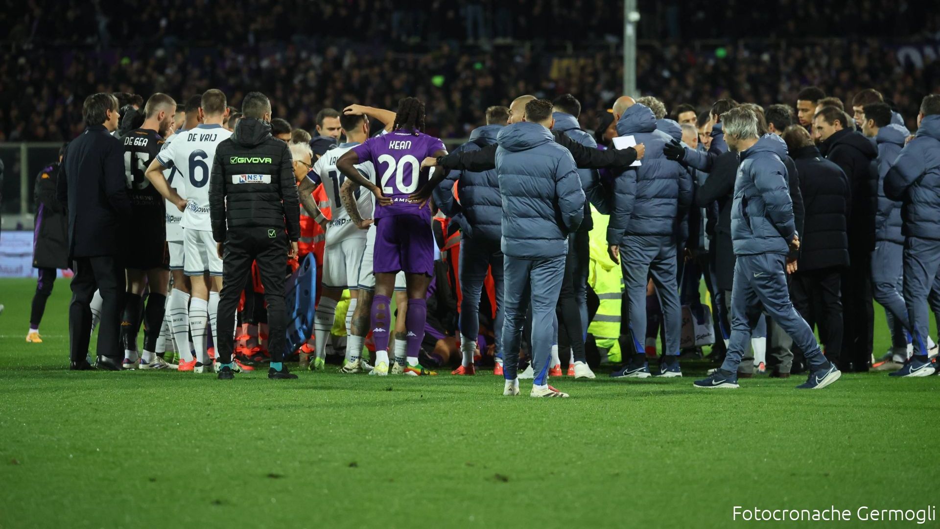 Momenti concitati, con i giocatori e i dirigenti delle due squadre che chiedevano l'ingresso dell'ambulanza che era sul lato Ferrovia. Anche il capitano viola, Ranieri, è andato con forza dai soccorritori ad invocare l'ingresso del mezzo. Alla fine Bove è uscito in barella e poi è stato fatto salire sull'ambulanza. Paura e rabbia si mischiavano in campo, sguardi persi, ragazzi con le lacrime agli occhi increduli per l'accaduto.