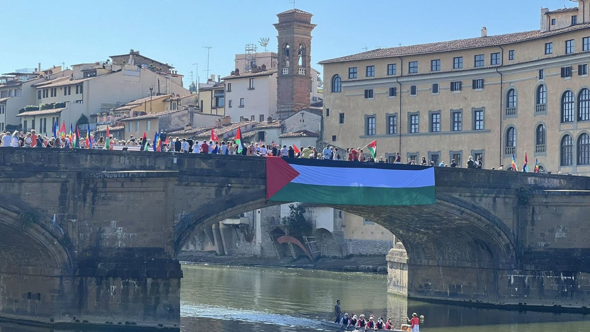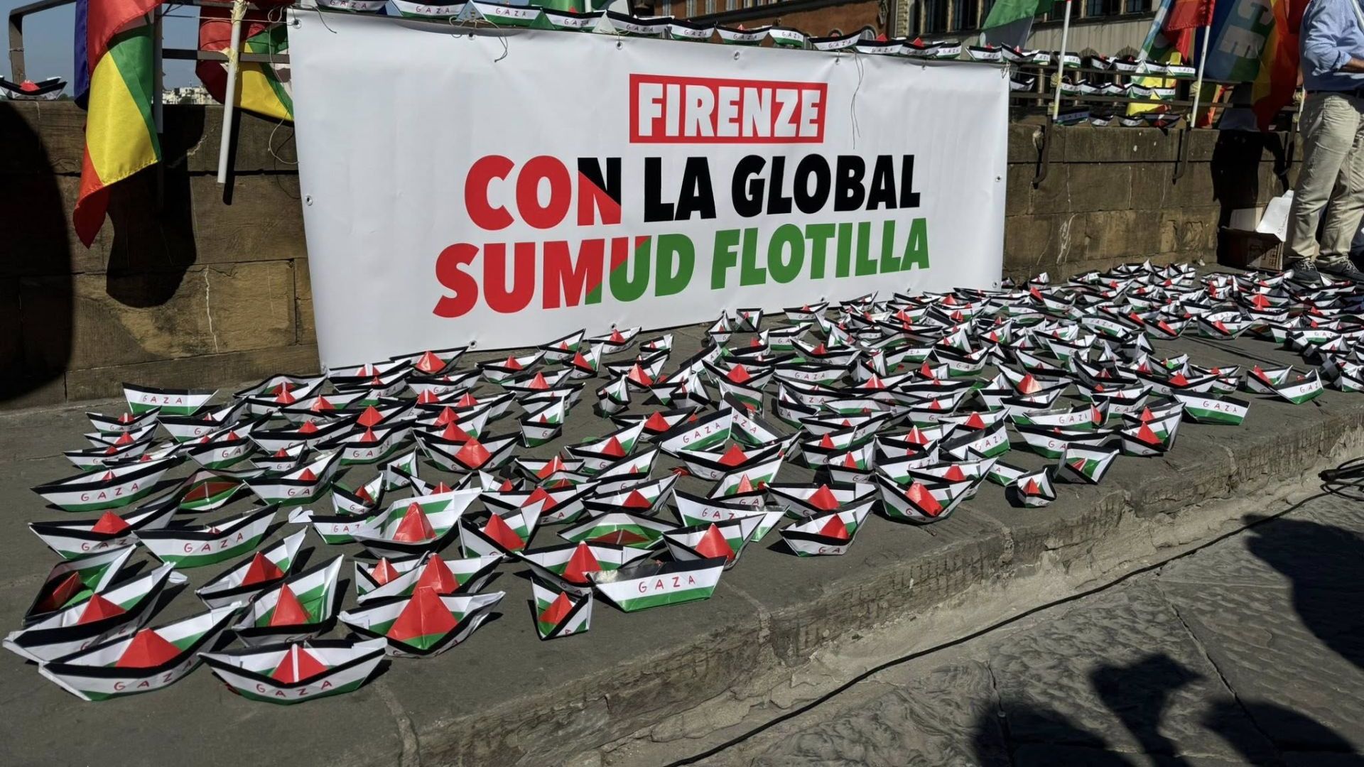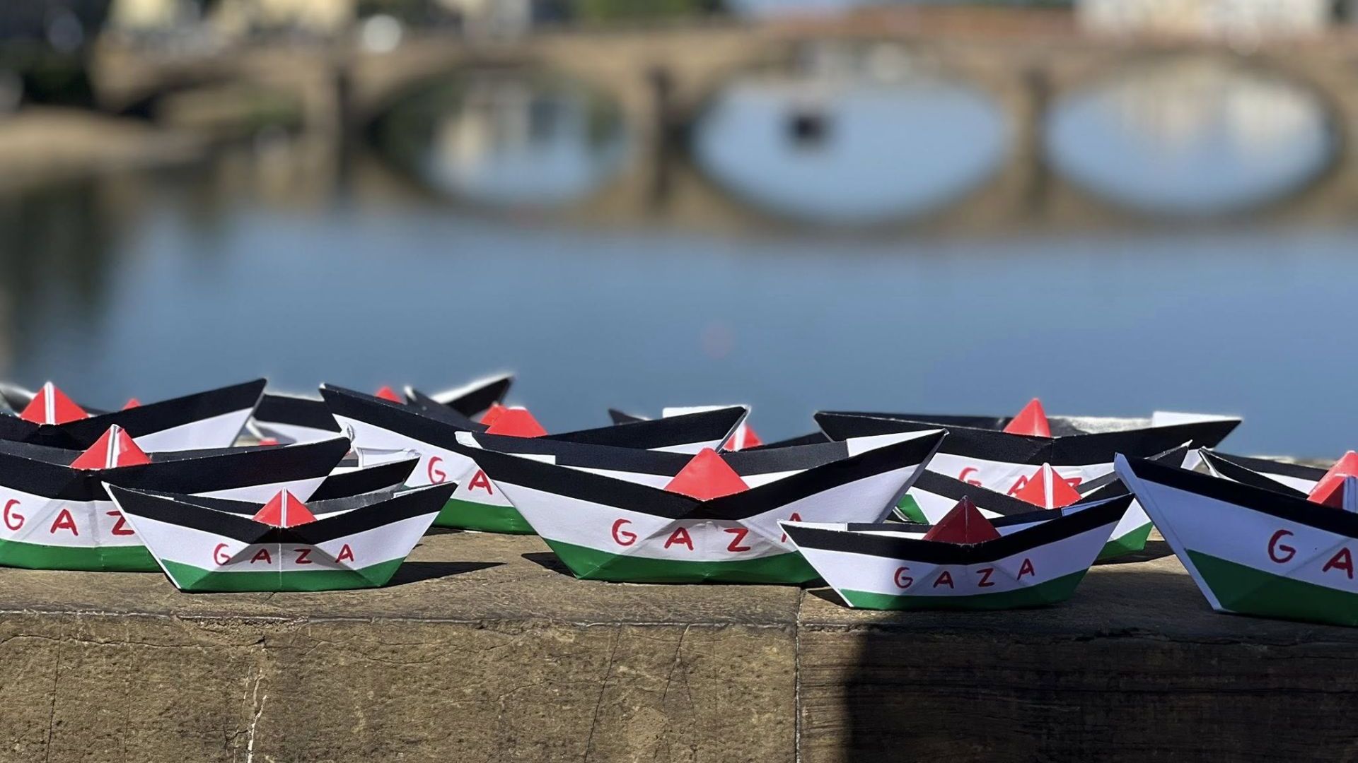 Firenze, il flash mob per la Global Sumud Flotilla: le barchette su ponte Santa Trinita