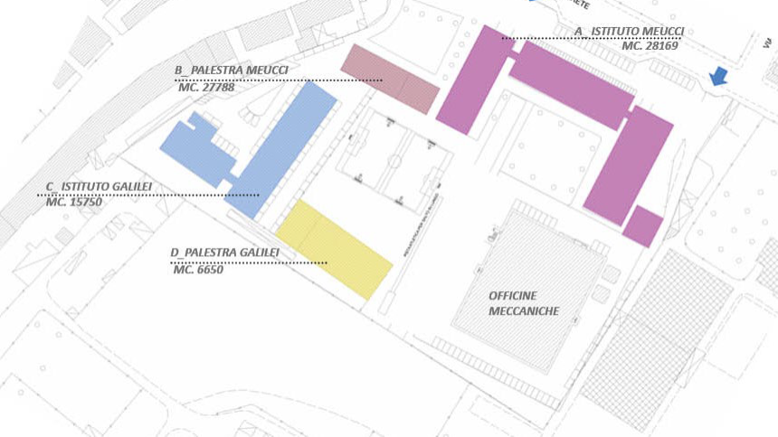La cosiddetta “Palazzina meccanica”, edificio di importanti dimensioni situato nell’area retrostante l’attuale Istituto Meucci, adibito a laboratori ed aule di pertinenza, sarà l’unico edificio esistente non ricompreso nella demolizione; manterrà la sua funzionalità in connessione al nuovo complesso scolastico ed in particolare al nuovo Istituto Meucci.