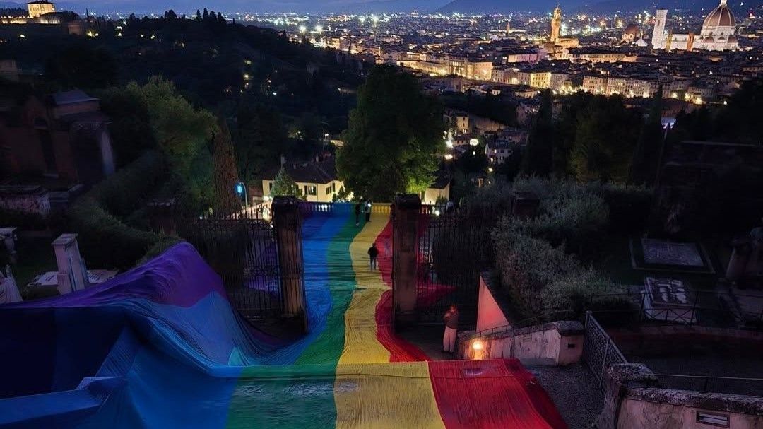 Firenze, una grande bandiera della pace sulle scale di San Miniato al Monte