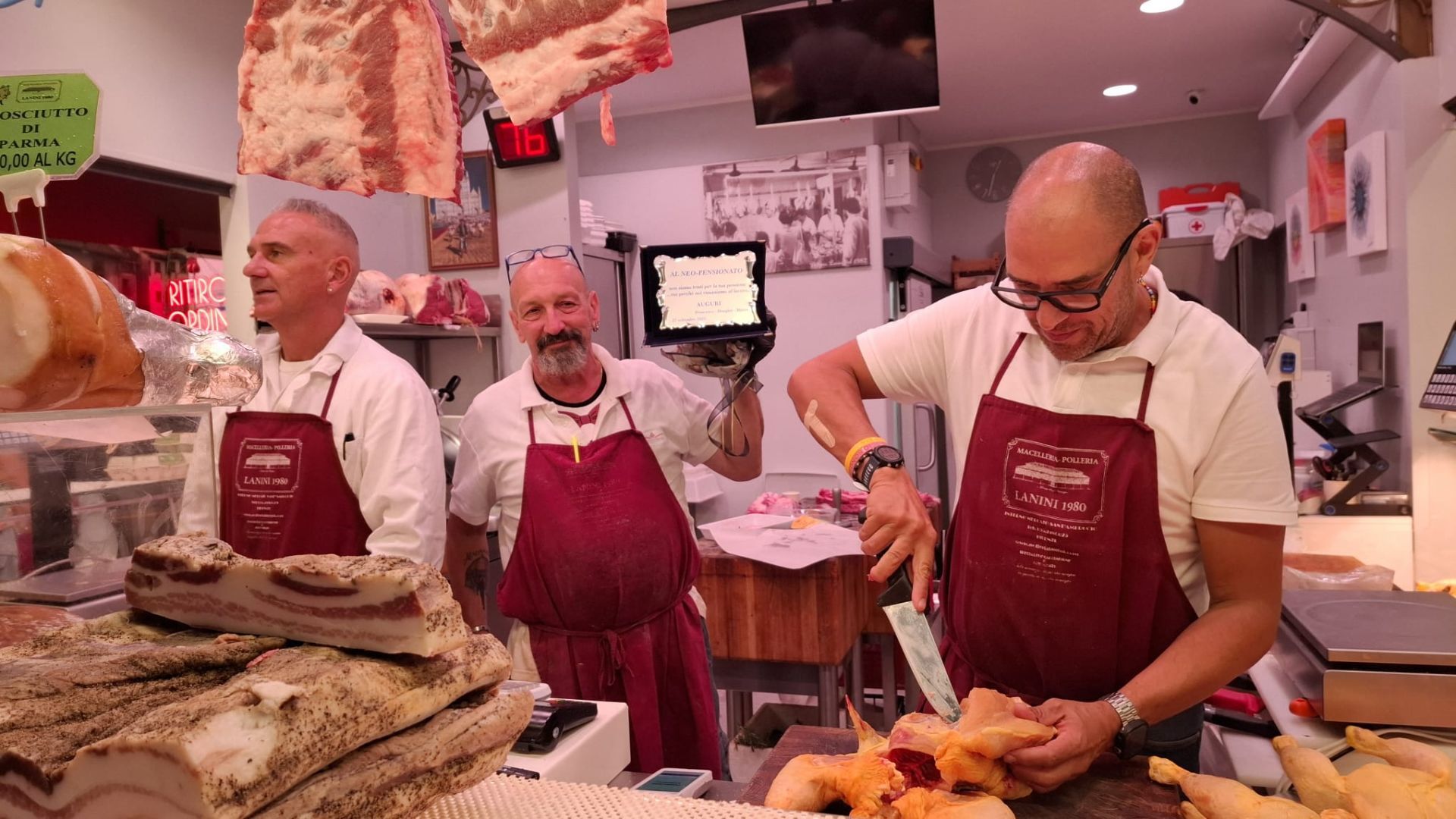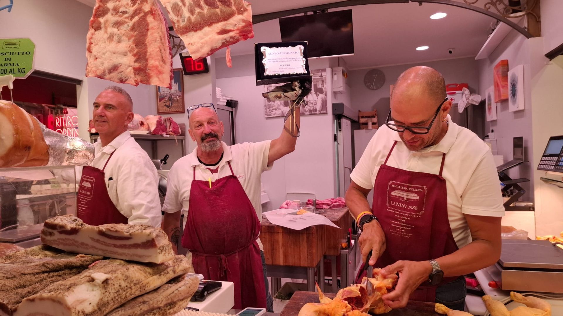 "Ringrazio Piero Lanini e la sua famiglia, ovviamente Francesco, i commercianti del mercato. Tutta la clientela: nell'ultimo mese e mezzo quando hanno saputo che andavo in pensione ho ricevuto attestati di stima e di affetto di cui vado orgoglioso", le parole di Alessio. "Da piccolo bottegaio vuol dire che ho lasciato il segno, ho dato tutto me stesso anche se non si finisce mai di imparare. Io sono un macellaio di quarta generazione: mio babbo, i miei zii, mio nonno. Se lo fai con il cuore è uno dei più bei lavori 'artigianali' fiorentini. Sono orgoglioso di aver fatto questo mestiere, sono cresciuto sotto gli insegnamenti di mio babbo".