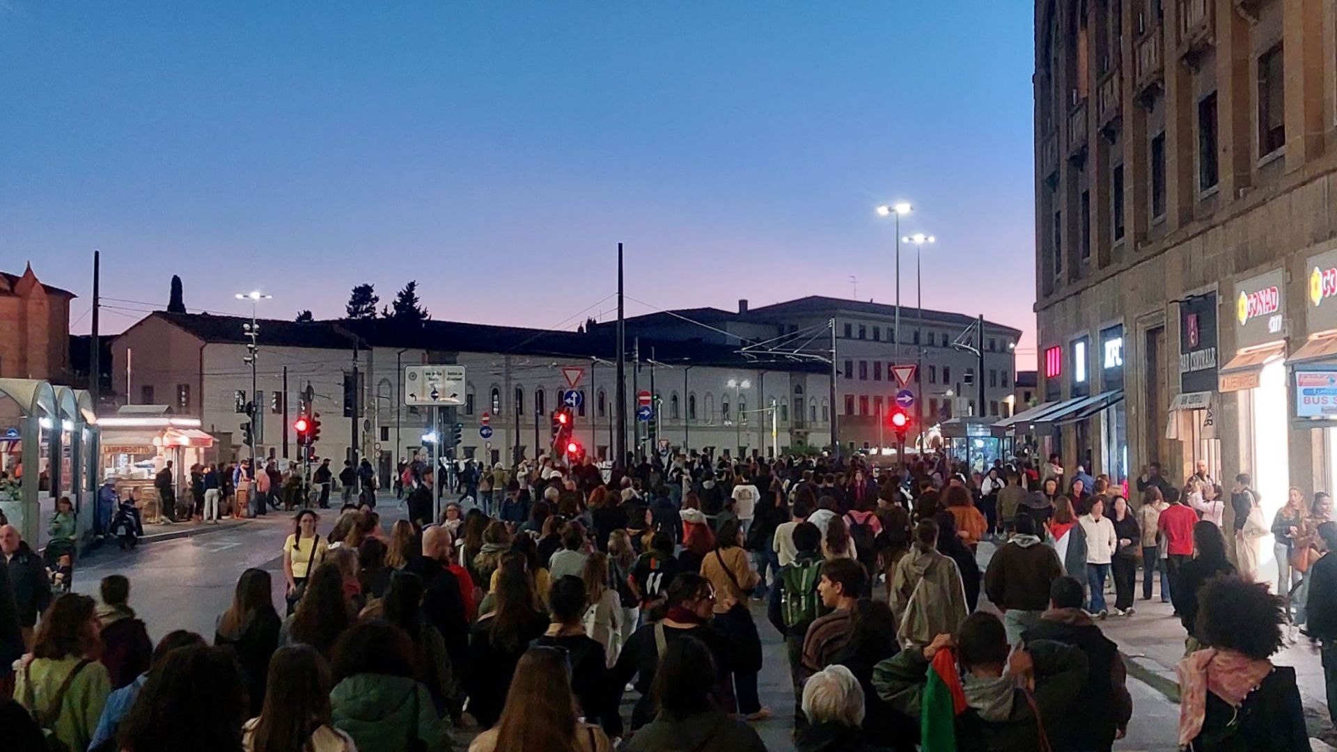 Dopo il concentramento, raggiunto in corteo anche gli studenti che si sono mossi dal plesso universitario di via Laura occupato da questa mattina, la manifestazione ha percorso via Guelfa girando poi in via Nazionale e arrivando in Largo Alinari nei pressi della stazione.