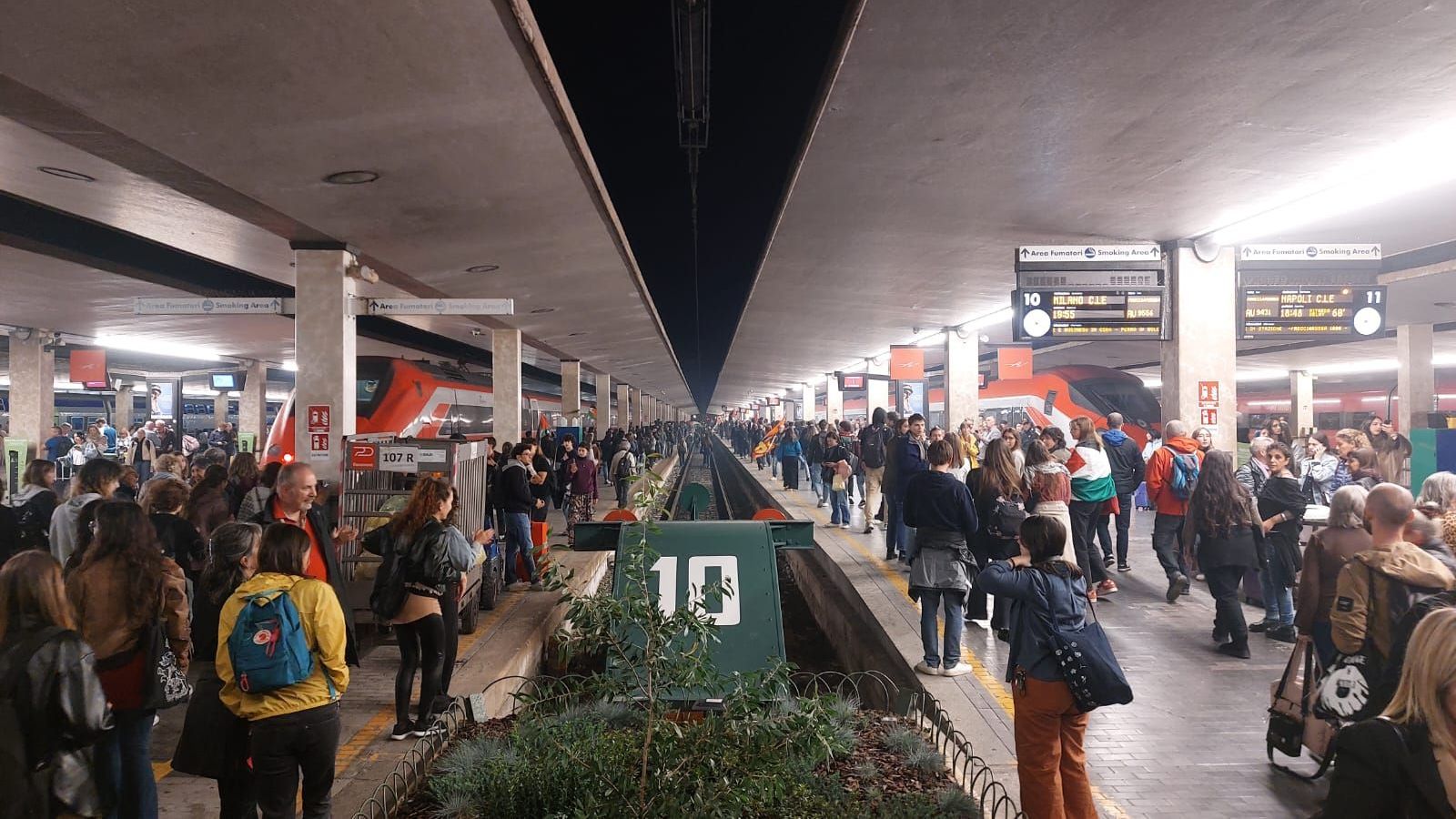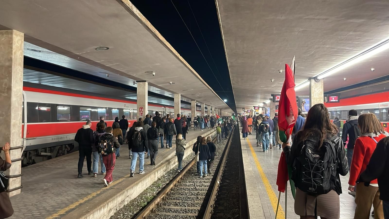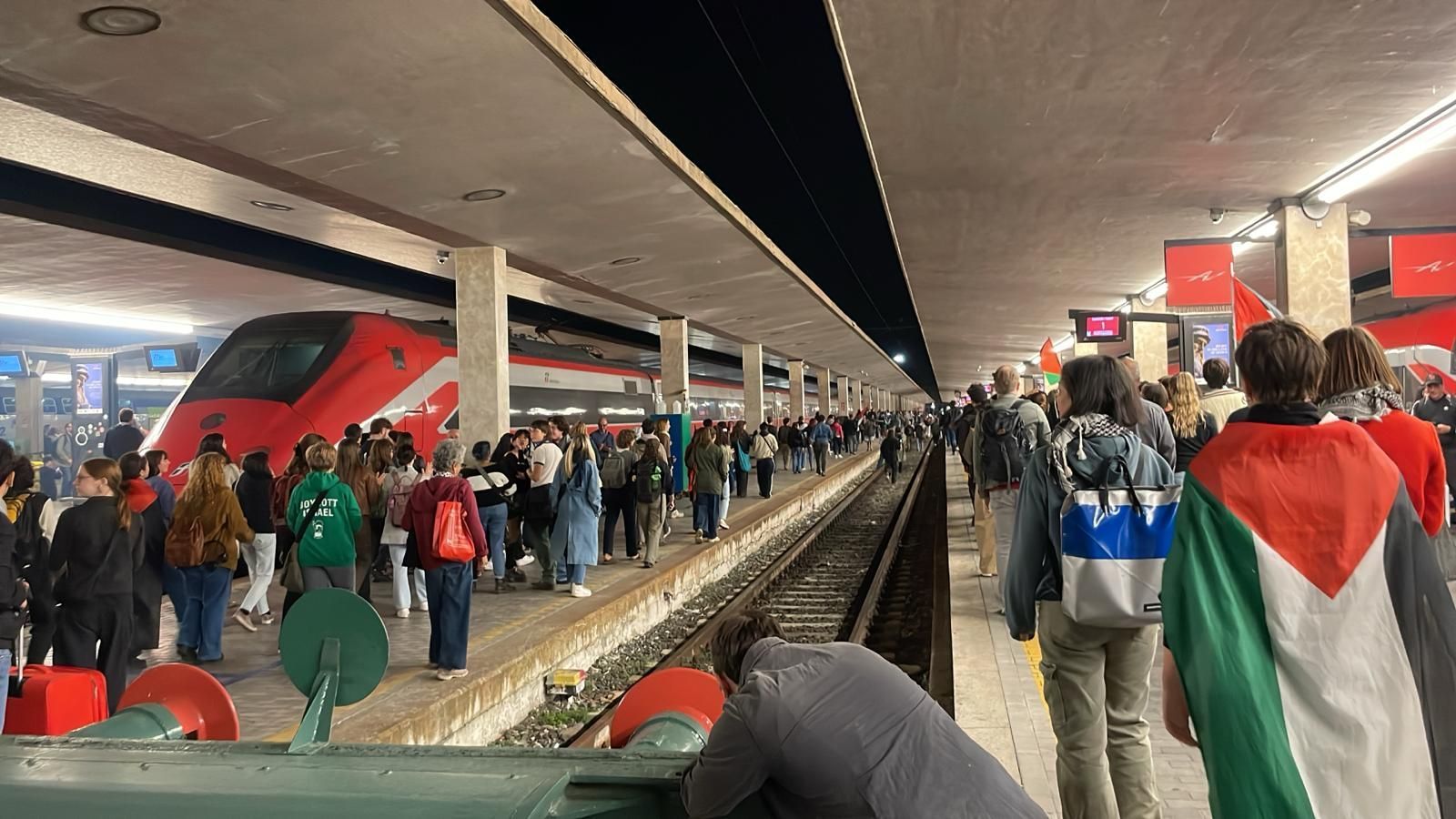 Cori e tamburi nell'atrio della stazione, i partecipanti hanno manifestato lungo i binari, intonando cori come "Palestina libera". Alcune persone si sono affacciate dai treni (fermi) presenti in stazione, facendo video e applaudendo i manifestanti.