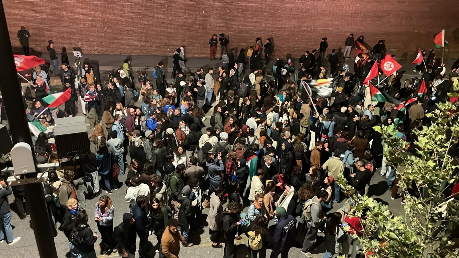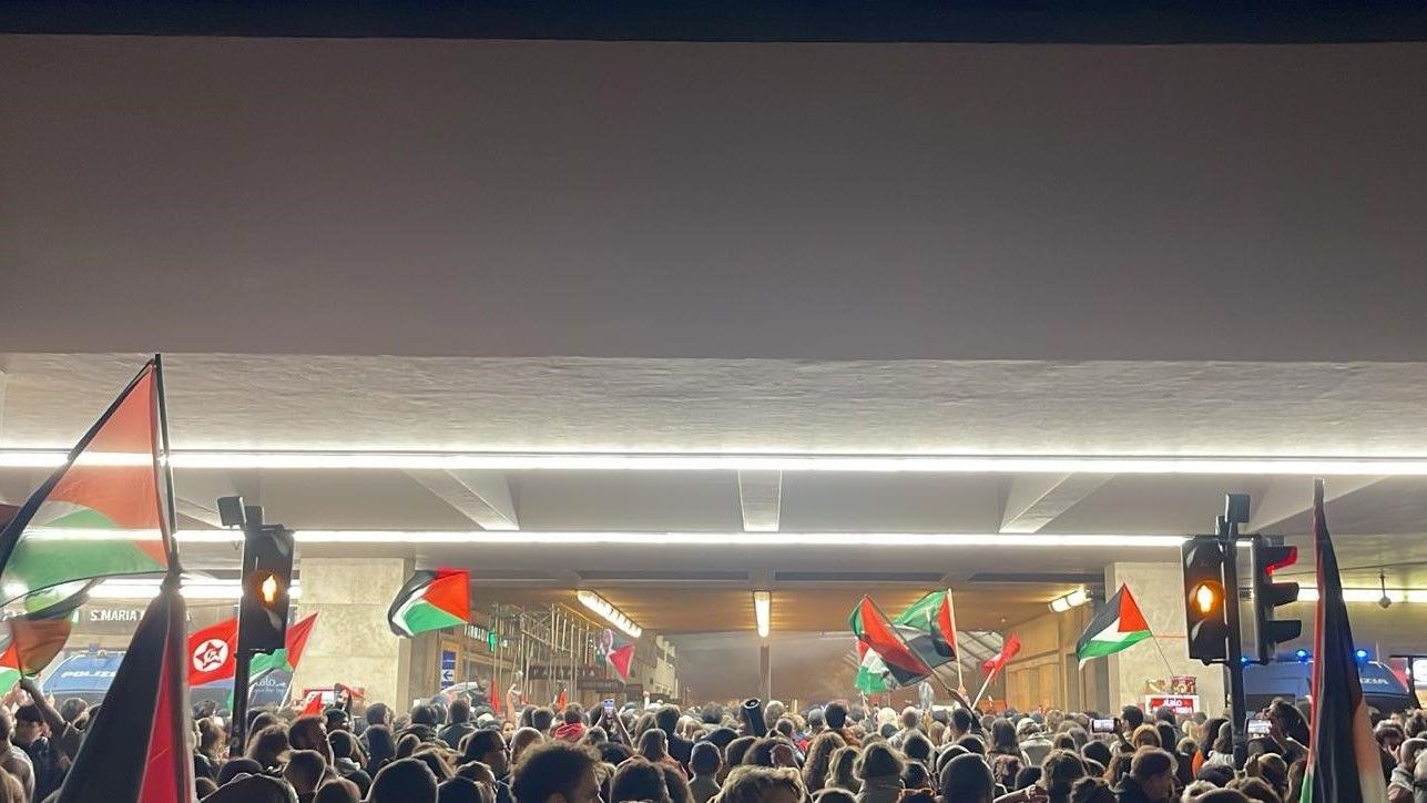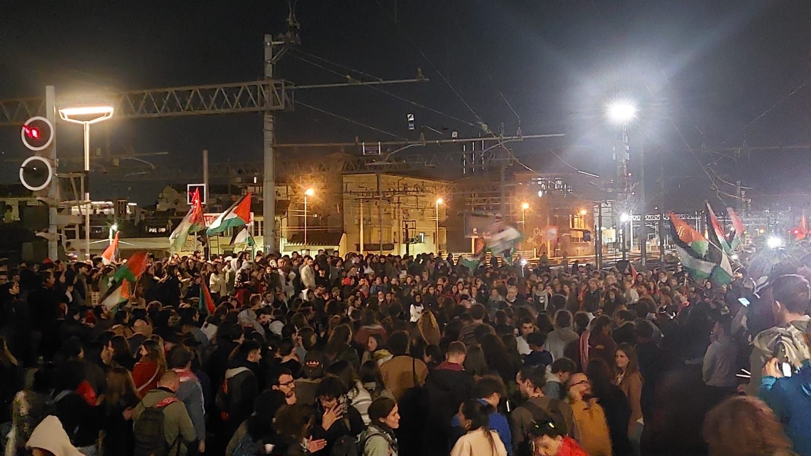 Cori e tamburi nell'atrio della stazione, i partecipanti hanno manifestato lungo i binari, intonando cori come "Palestina libera". Alcune persone si sono affacciate dai treni (fermi) presenti in stazione, facendo video e applaudendo i manifestanti.