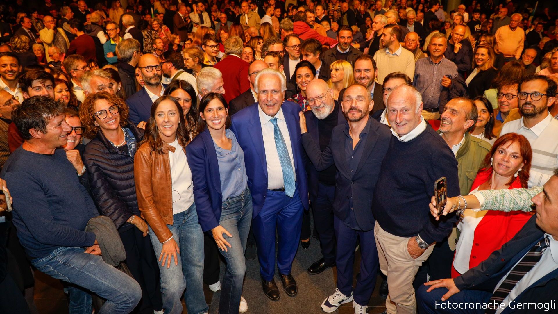 Platea piena al Teatro Cartiere Carrara: 'Domenica dobbiamo vincere, c’è bisogno di tutti'. E stasera arriva Meloni per Tomasi