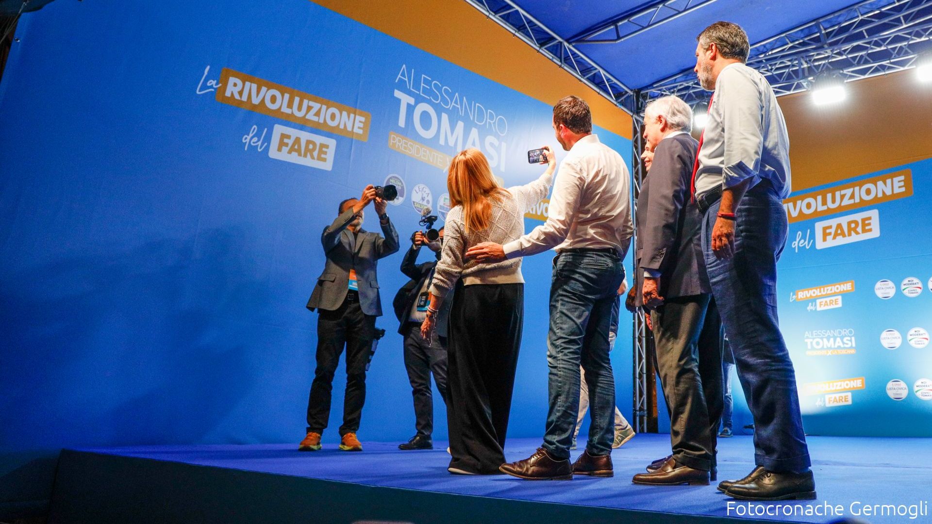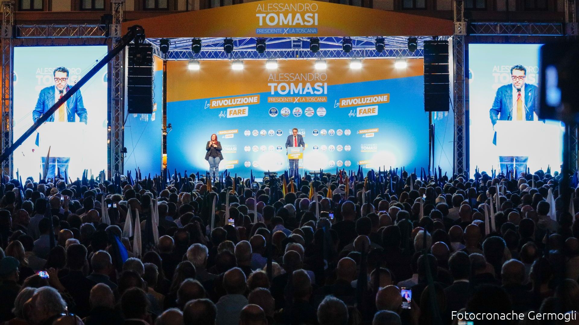 Tomasi tocca diversi temi, dalla sicurezza: "Voglio la sicurezza le piazze e i giardini contro lo spaccio, con la famiglia, quando manca la sicurezza ci rimettono i più deboli. Non è giusto che le persone vengano rapinate nei centri storici, che un commerciante si trovi una spaccata. Chi pensa alla sicurezza pensa ai più deboli", all'ambiente "dobbiamo smetterla con le discariche e l'inquinamento dei fiumi e delle acque, dobbiamo farlo per i nostri ragazzi. Se ne sono andati in quattromila, 2500 laureati, perché non trovano lavoro qua, perché non hanno diritto alla casa, alla mobilità". Poi sul reddito di cittadinanza: "Nessun toscano mi ha chiesto il reddito di cittadinanza, si sono sempre arricciati le maniche. Quel reddito vale 100 milioni in 5 anni, che io voglio spendere per i disabili, per i giovani, per gli anziani, per le aziende, ci sono mille modi, e non per l'assistenzialismo, è tradire il dna dei toscani. Vogliamo uscire con le nostre forze dalle difficoltà". "La Toscana ha tutto quello che serve per farcela, basta rimetterlo in moto. Io vi ho portato fin qui, ho dato tutto, ora tocca a voi fare la rivoluzione, il 12 e 13 ottobre, andiamo a votare", conclude Tomasi.