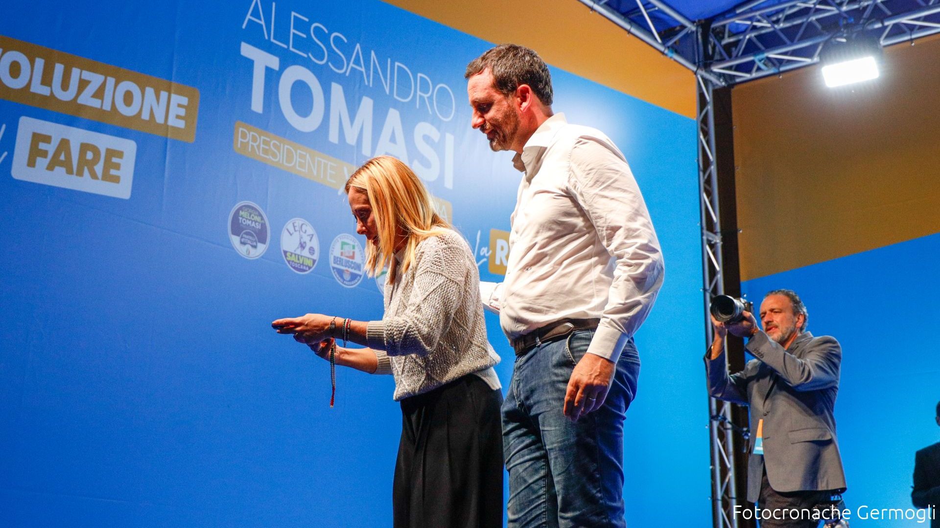 "Dicono che Tomasi sia una candidatura di bandiera, e lo è, di un centrodestra e di un popolo che alza in alto la bandiera del cambiamento, di una visione di sviluppo, per questo territorio, per la sua gente, di una politica che vuole investire sul tuo valore e la tua libertà e non richiede la tessera di partito per fare quello che la politica deve fare", continua Meloni.