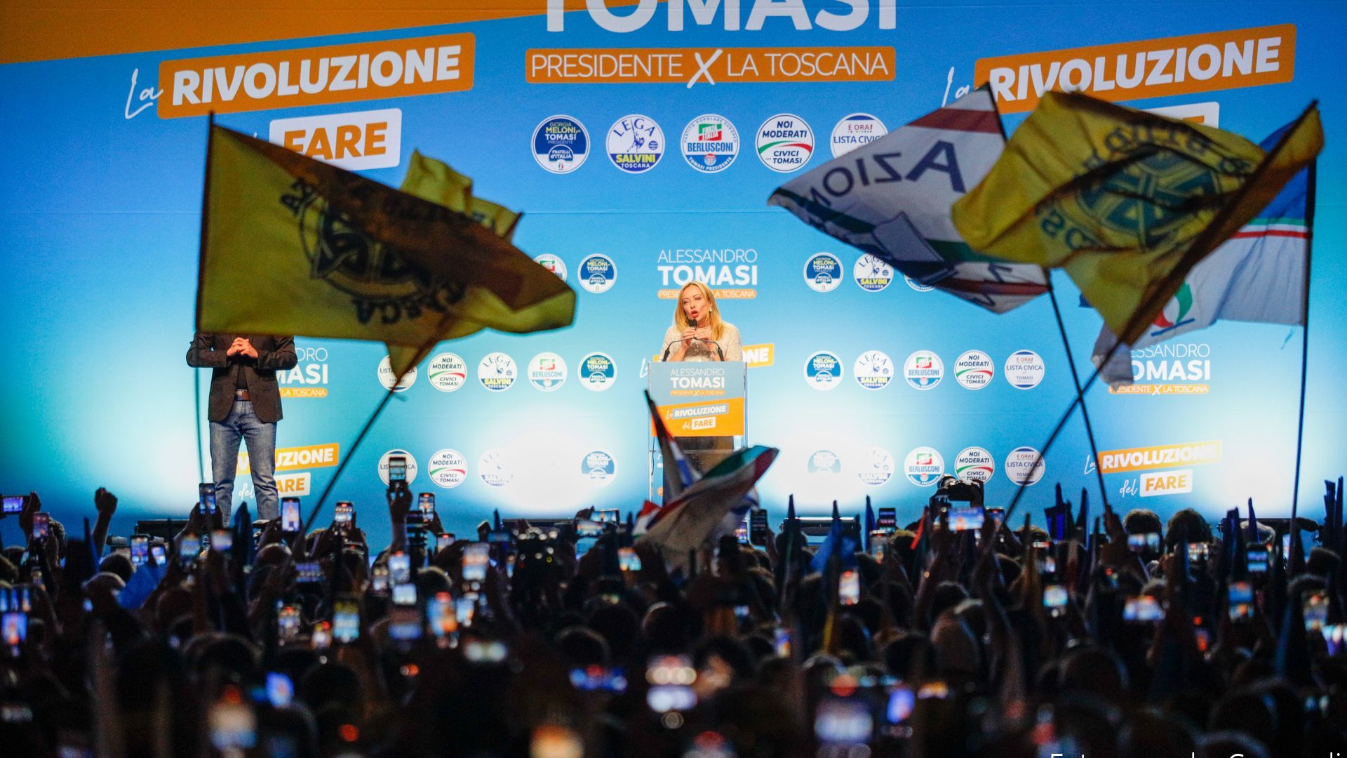 "Non ci facciamo fare la morale da una sinistra sempre più radicalizzata, non è un campo largo, è un enorme centro sociale. Noi continueremo a lavorare col sorriso, a dare risposte, a far quello che dobbiamo con amore e non con odio. E' il nostro campo di gioco a livello nazionale e qui in Toscana, dove con Tomasi abbiamo un programma che parla di cose concrete, di sviluppo, sanità a misura di cittadino, di natalità, abbiamo le idee chiare, più dell'altra parte, dove c'è un presidente che cambia spesso idea. Manca qualche giorno. Questa terra orgogliosa merita di più, non fatevi convincere che il risultato è già scritto, perché sarete voi a scriverlo. Battetevi più di quanto i vostri avversari si aspettano, la storia la fate voi", conclude Meloni.