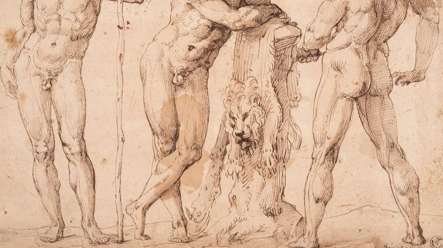 Scuola di Baccio Bandinelli, Tre figure maschili, prima metà del XVI secolo – attribuito alla scuola del maestro; la figura centrale, appoggiata a un tronco da cui pende la pelle del leone, è riconducibile anch’essa a Ercole.