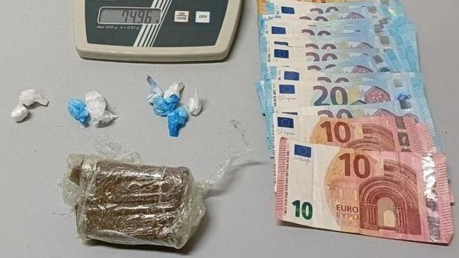 Estesi i controlli nella sua abitazione, gli agenti hanno rinvenuto 1375 euro, vari involucri contenente cocaina per un totale di 75 gr. circa, un panetto contenente hashish di 66 gr. circa, un bilancino digitale e materiale verosimilmente da confezionamento.