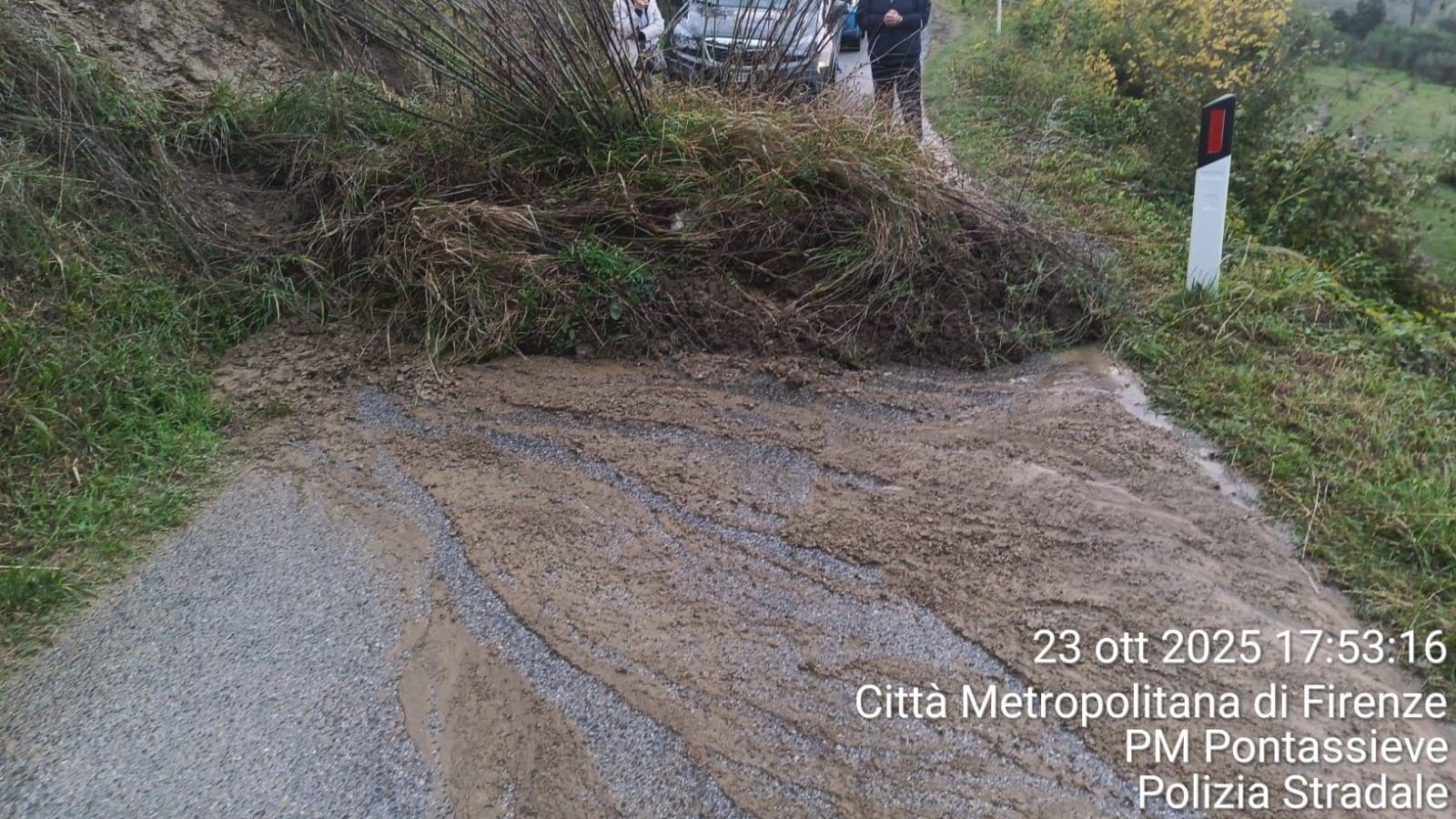 Frana in strada a Pontassieve. Nel tardo pomeriggio di oggi, giovedì 23 ottobre, il Comune di Pontassieve segnala, in Via del Palagio in Colognole, (località Madonnina, prima del centro abitato di Colognole) una frana di lieve entità che interessa la carreggiata e che ha costretto alla chiusura forzata della strada.