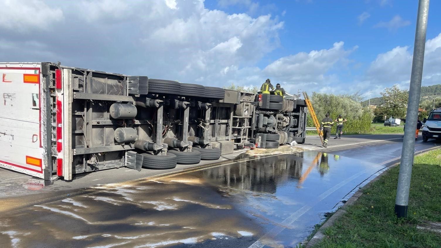 Un autoarticolato si è ribaltato sulla strada provinciale di Rosano, all'altezza della rotonda di Quarto, nel territorio comunale di Bagno a Ripoli (Firenze).