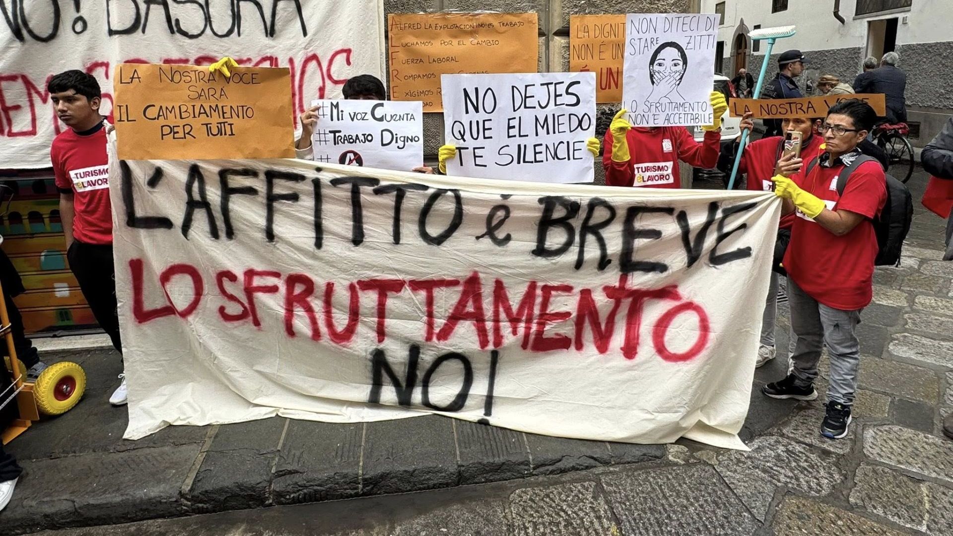 "L'affitto è breve lo sfruttamento no", queste le parole scritte su uno striscione esposto durante il presidio per lo sciopero degli addetti alle pulizie degli appartamenti adibiti agli affitti brevi, che oggi, per la prima volta in Italia, si sono fermati.