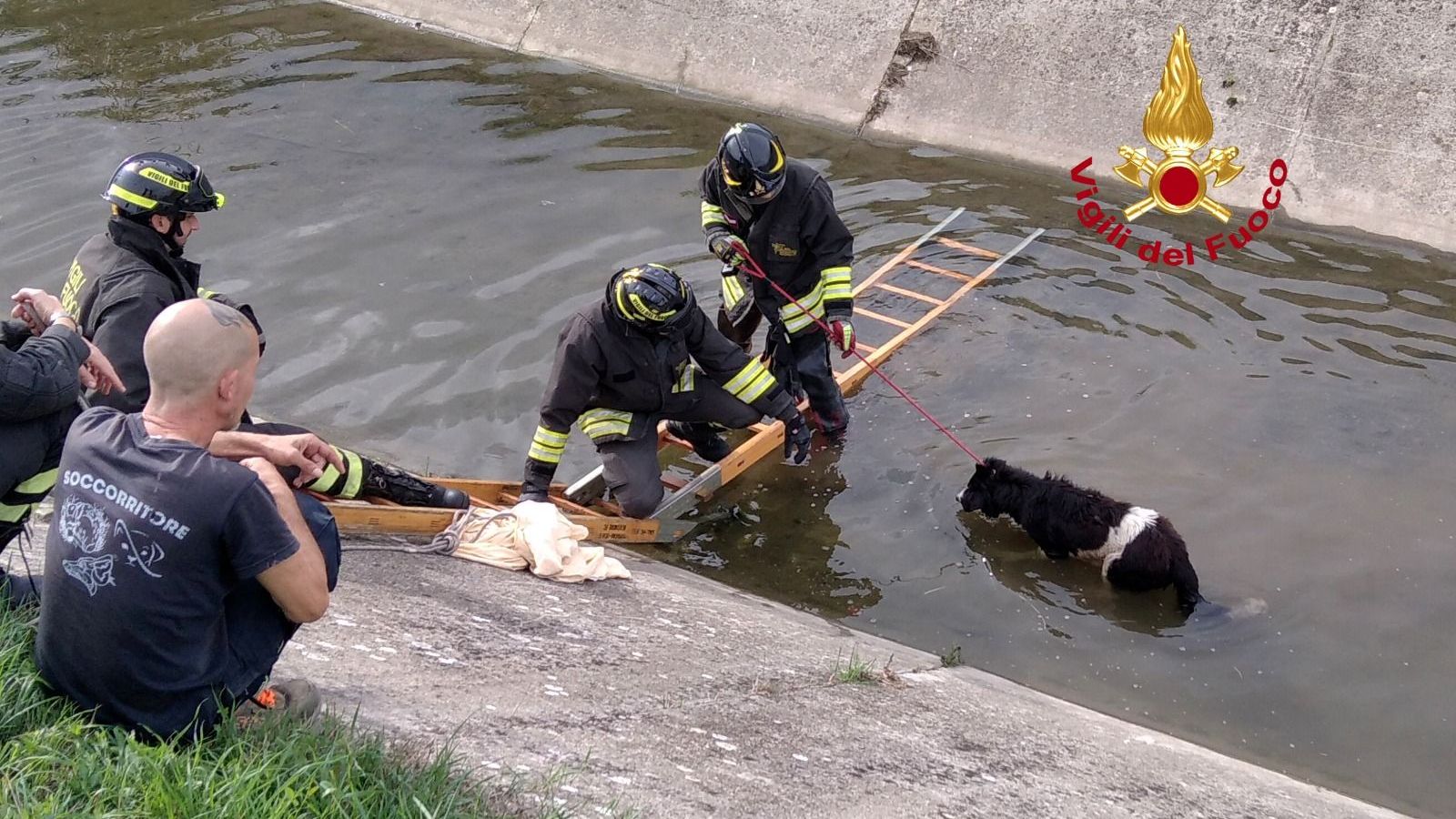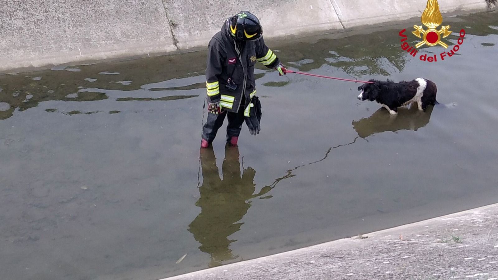 Sul posto sono intervenuti i Vigili del fuoco, con una squadra: sono scesi all’interno del canale e hanno recuperato il cane, apparentemente sfinito, con l’acqua che immergeva completamente le zampe.