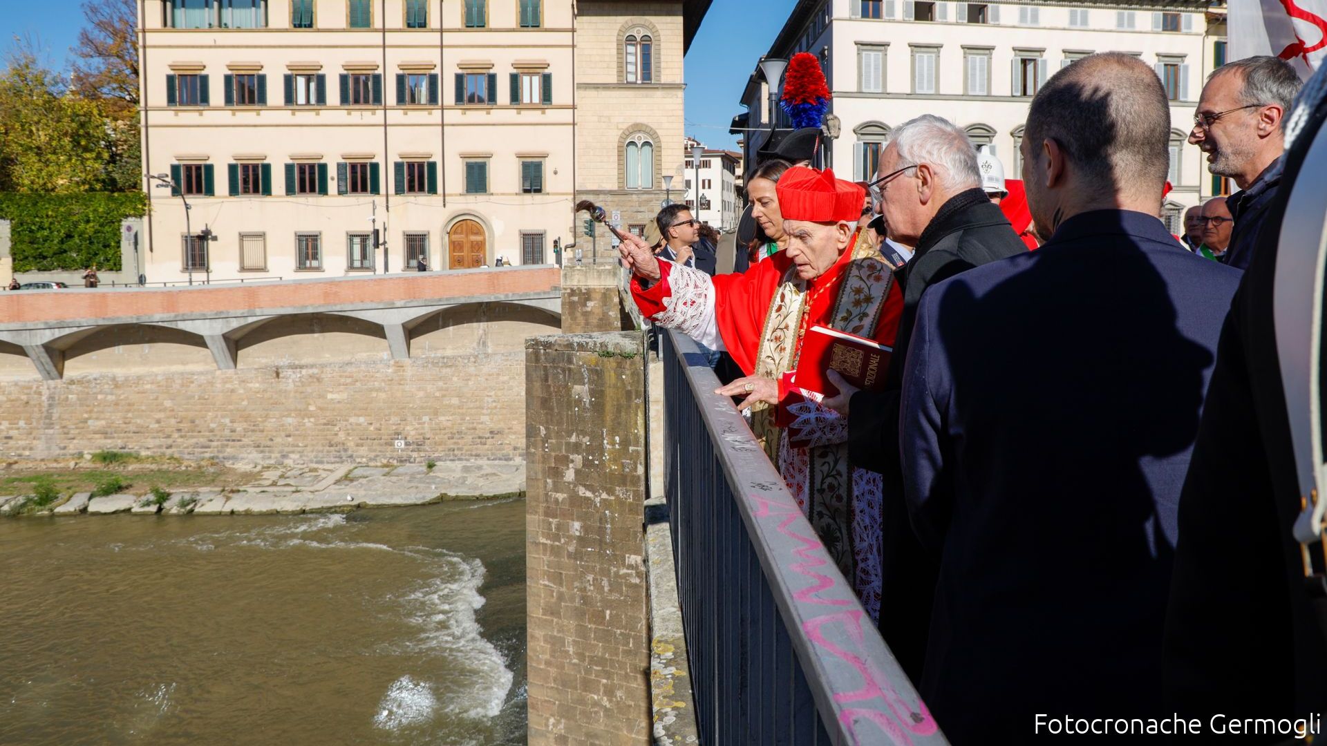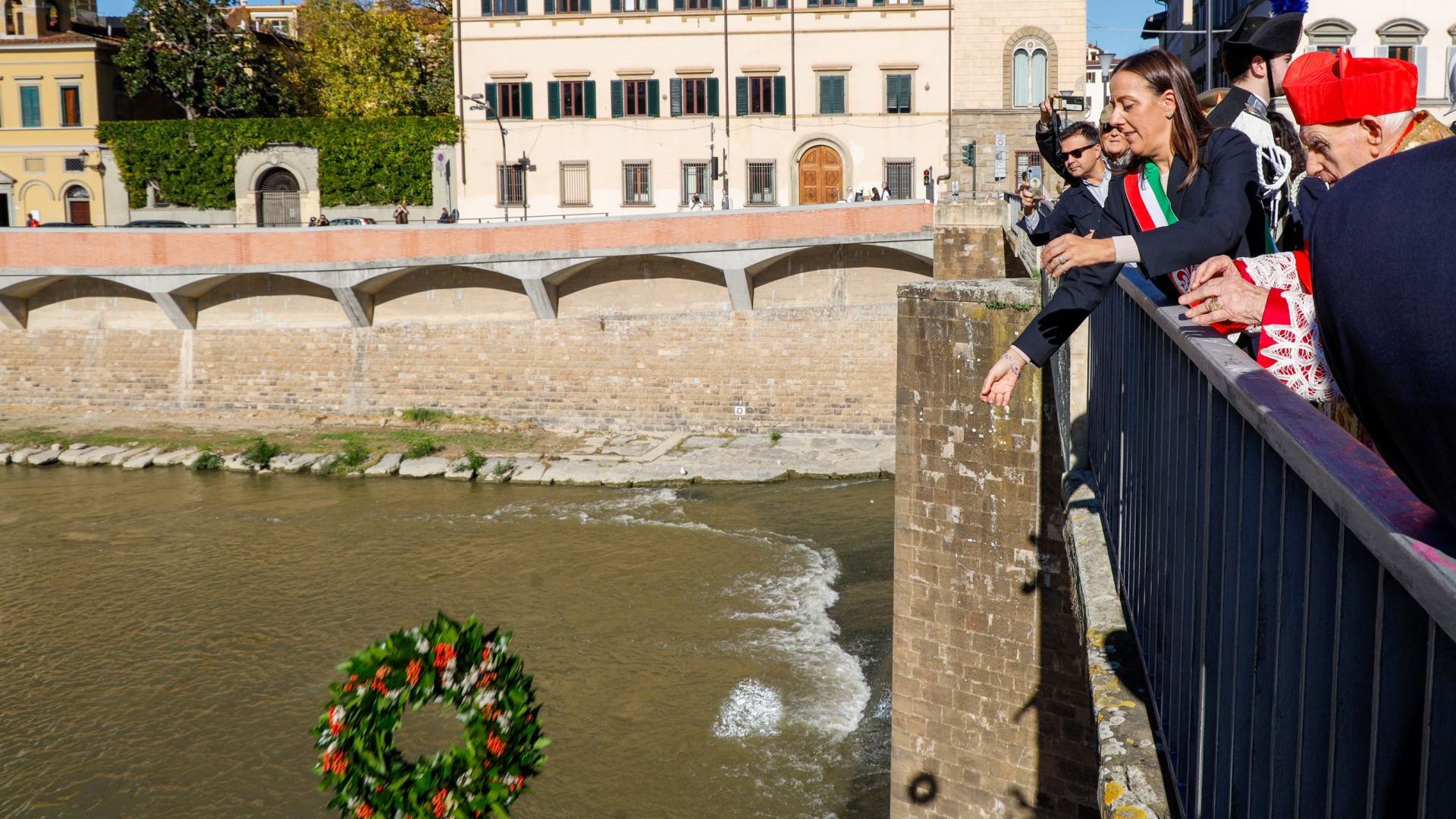 Al termine della funzione, un lungo corteo commemorativo è partito dalla Basilica di Santa Croce verso il Ponte alle Grazie, aperto dal Gonfalone di Firenze e scortato dai vigili a cavallo. All’Oratorio di Santa Maria alle Grazie è stata benedetta la corona d’alloro, poi lanciata nelle acque dell’Arno dalla sindaca Sara Funaro insieme al Cardinale Ernest Simoni, in segno di memoria verso tutte le vittime dell’alluvione del 1966.