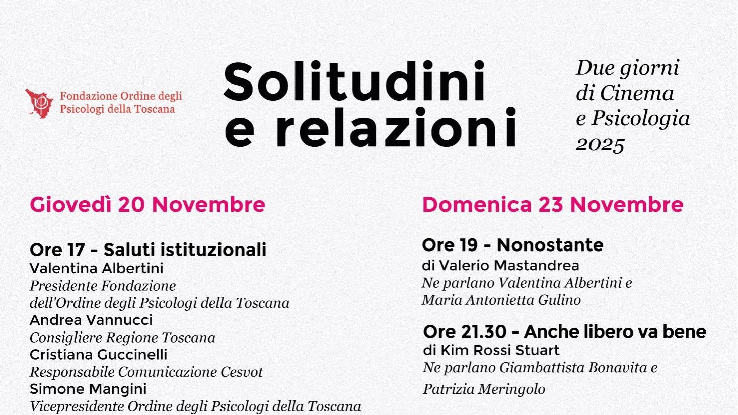 Si chiama "Solitudini e Relazioni – Due giorni di Cinema e Psicologia 2025" la rassegna promossa dalla Fondazione dell’Ordine degli Psicologi della Toscana, in collaborazione con l’Ordine degli Psicologi della Toscana e Cesvot e il contributo di Fondazione CR Firenze, che propone film che affrontano le sfaccettature della solitudine, seguiti da dibattiti con psicologi.