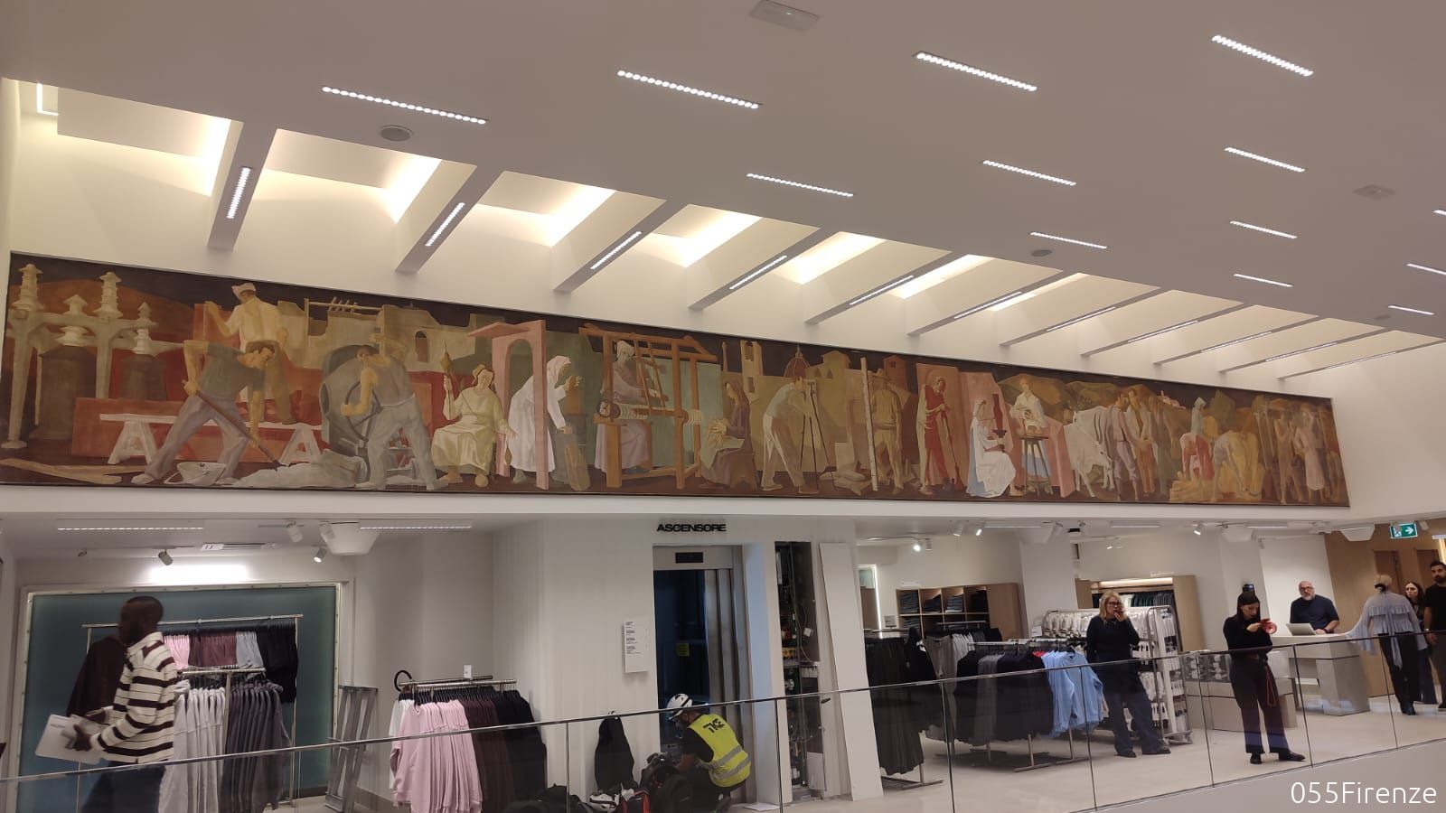 All’interno dello store trovano posto gli affreschi realizzati nel 1953 in occasione della riapertura della Borsa Merci e restaurati da H&M nel 2016. Al piano 1, nell’ex sala delle contrattazioni, è visibile il lavoro monumentale di Sineo Gemignani, La ripresa delle attività, lungo 17 metri. Al piano -1, nell’ex sala riunioni, si trova invece la composizione di Renzo Grazzini, lunga 15 metri e caratterizzata da richiami ai maestri del Novecento. La nuova configurazione del negozio mira a migliorarne la leggibilità e li integra nel percorso interno.