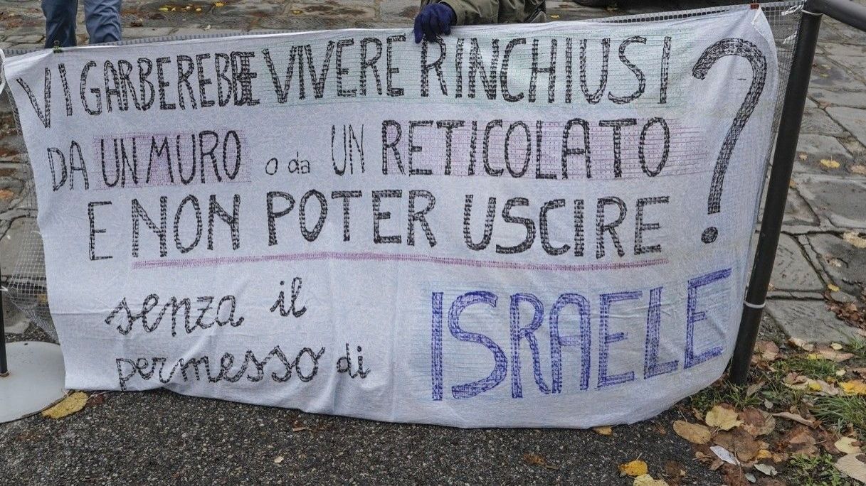 Lo striscione: 'Vi garberebbe vivere rinchiusi da un muro o da un reticolato e non poter uscire senza il permesso di Israele?'