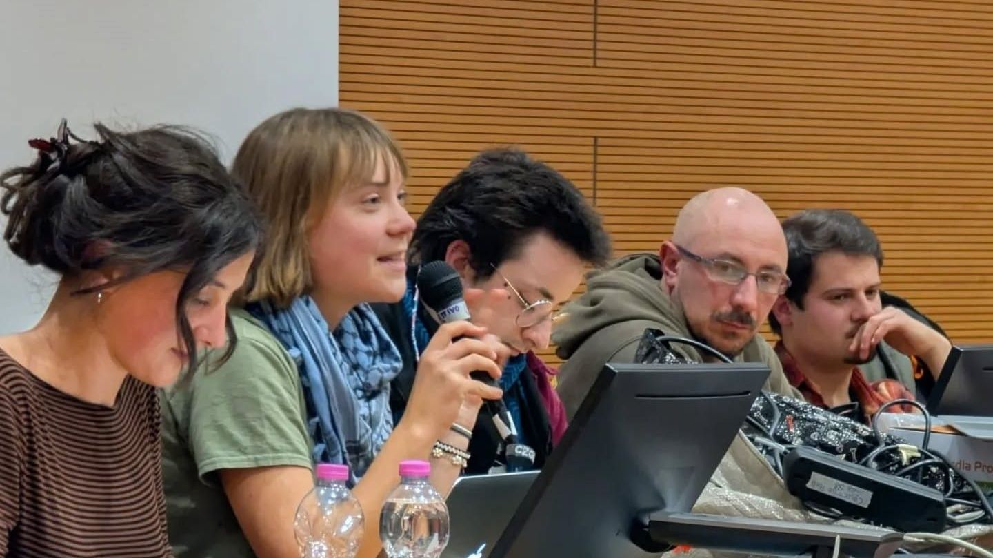 "Genocidio, riarmo, catastrofe climatica: le ragioni della convergenza. Il caso ex Gkn e il rilancio della reindustrializzazione ecologica dal basso", questo il titolo dell'assemblea alla quale ha partecipato anche l'attivista svedese.