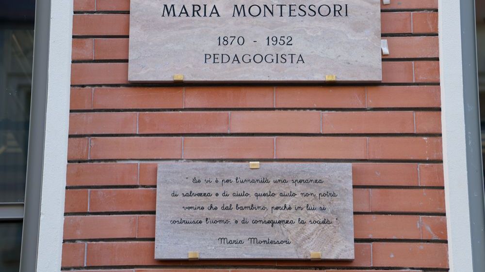 La targa riporta una frase di Maria Montessori, incisa in corsivo, stile che lei prediligeva: “Se vi è per l’umanità una speranza di salvezza e di aiuto, questo aiuto non potrà venire che dal bambino, perché in lui si costruisce l’uomo, e di conseguenza la società”.
