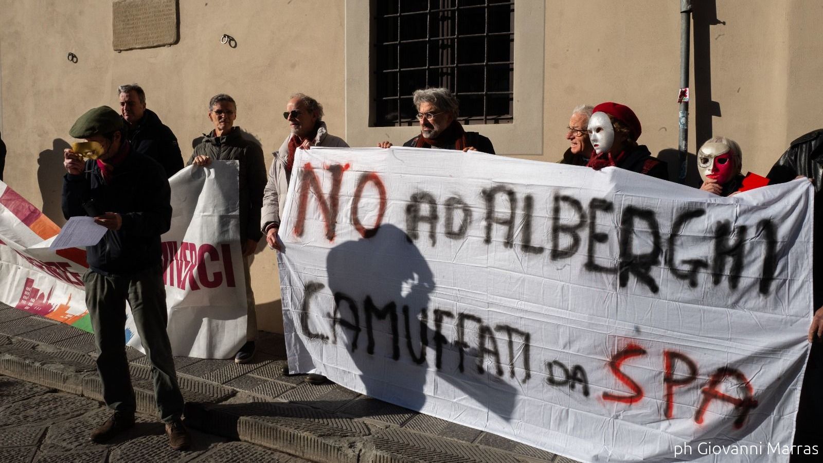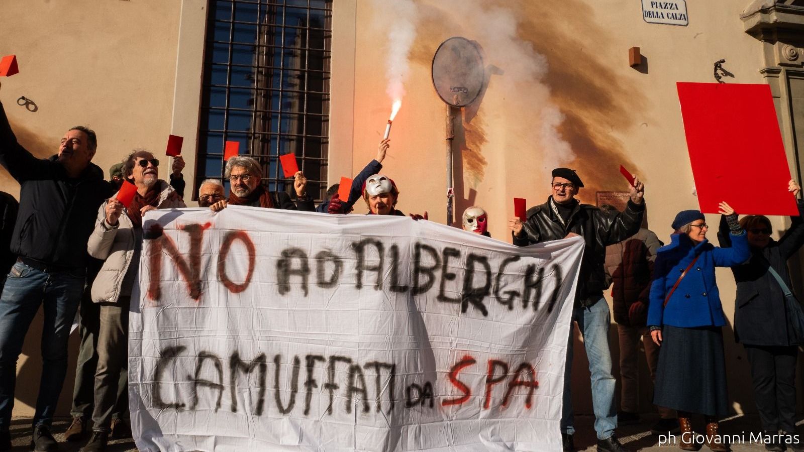 "Siamo a questo flash mob con uno striscione: No ad alberghi camuffati da spa. Potevamo sostituire la parola Spa con: foresteria, centro benessere, studentati. Ma l’elenco sarebbe incompleto. Infatti abbiamo un regolamento Comunale pensato perché ci siano già e ci possano essere decine di alberghi camuffati, da Spa o da altro. Ma a parole si dice che gli alberghi in questa città sono bloccati. Ad oggi nella stessa categoria Urbanistica-direzionale stanno gli uffici, le Spa, le palestre etc etc con il ricettivo non alberghiero, ovvero foresterie, studentati, ostelli", continua Salviamo Firenze per Viverci