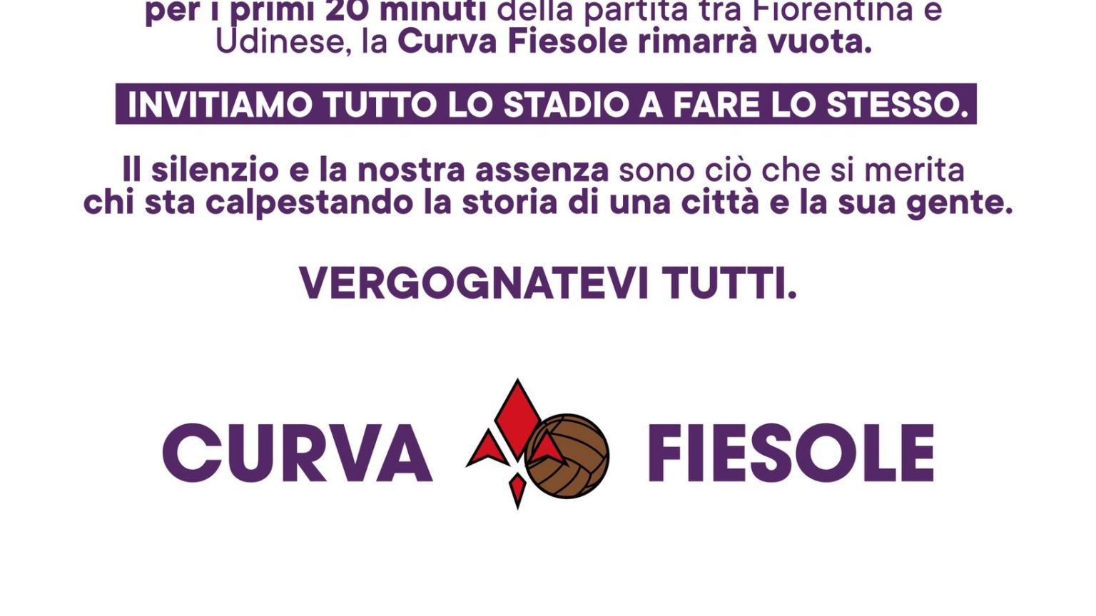 La Curva si svuota. "Lo scempio che squadra e società stanno portando avanti ha ormai superato ogni limite di sopportazione per tutto il popolo viola. I gruppi organizzati, pertanto, comunicano che per i primi 20 minuti della partita tra Fiorentina e Udinese, la Curva Fiesole rimarrà vuota. Invitiamo tutti a fare lo stesso".