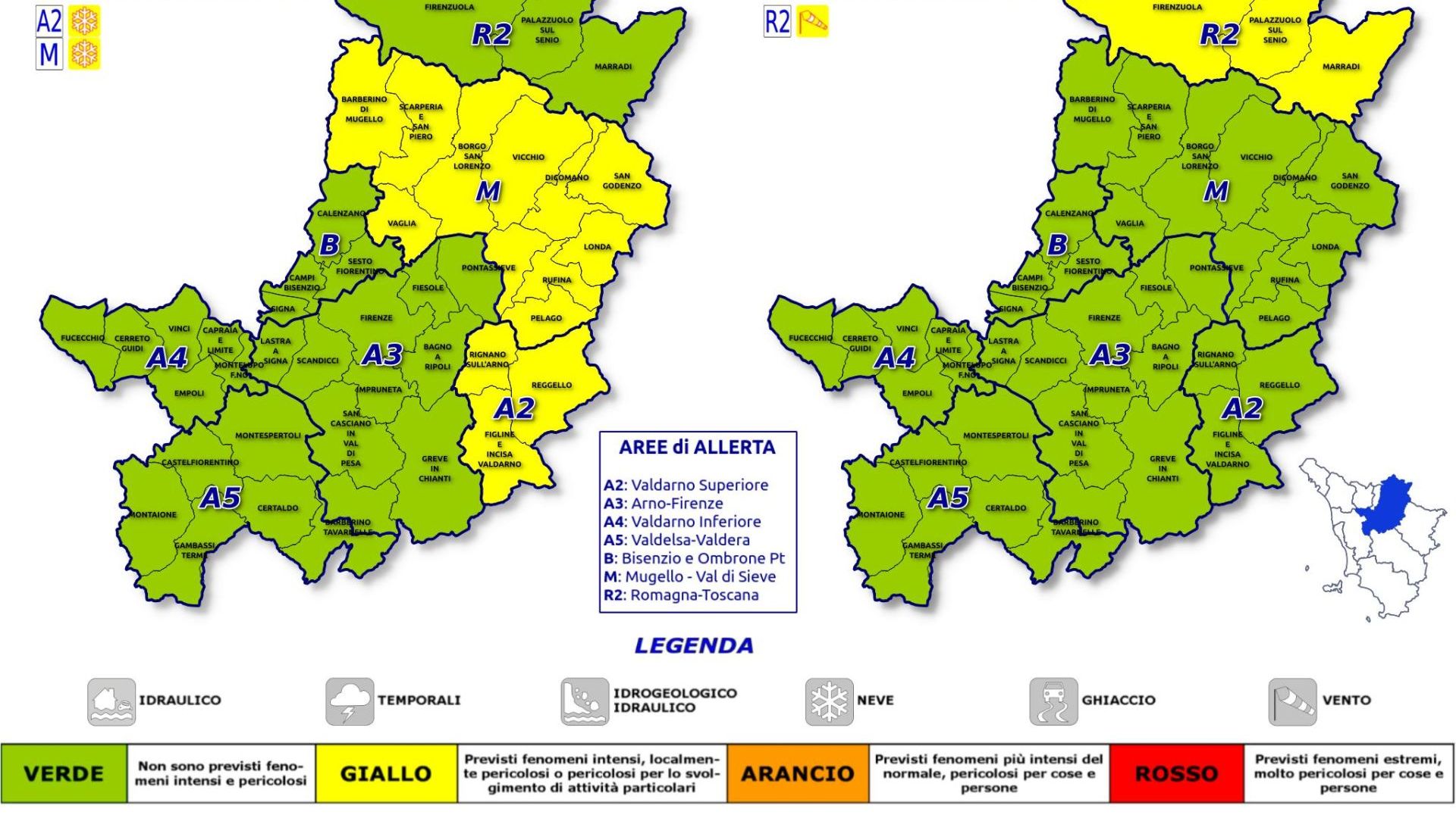 Allerta per vento e neve nel fiorentino. E' in corso fino alle 20 di stasera un'allerta meteo in codice giallo per rischio neve per le zone Mugello-Val di Sieve e Valdarno Superiore.