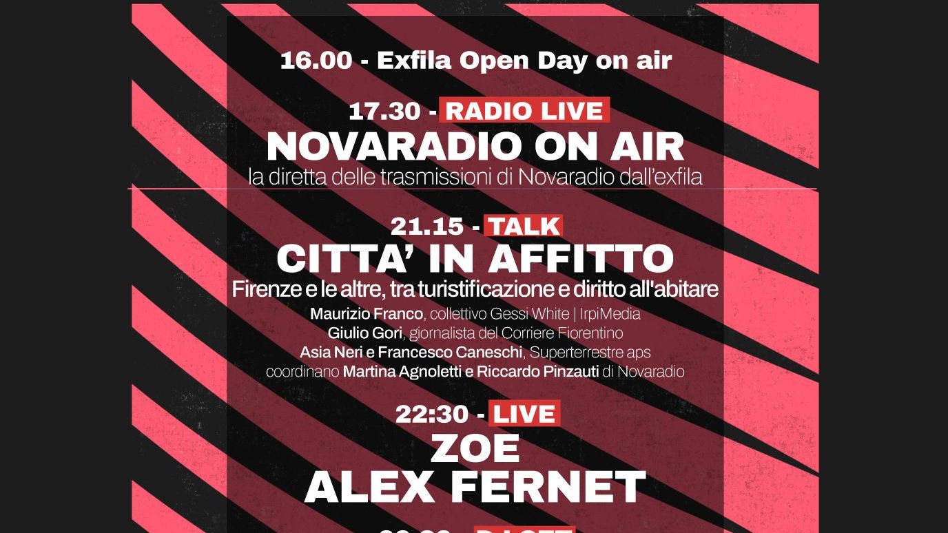 Dalle 21:15 nell'auditorium dell'Exfila inizierà il programma della serata. Aprirà il talk "Città in affitto" Firenze e le altre, tra turistificazione e diritto all'abitare. Un incontro coordinato dai giornalisti della redazione di Novaradio, Martina Agnoletti e Riccardo Pinzauti, che vedrà la partecipazione di vari ospiti. Saranno presenti Maurizio Franco, giornalista del collettivo Gessi White di IrpiMedia che presenterà il libro “Città in affitto, un requiem per il diritto all’abitare", edito da Laterza; Giulio Gori, giornalista del Corriere Fiorentino che negli ultimi anni ha dedicato grande attenzione agli effetti dell'overtourism a Firenze e Asia Neri e Francesco Caneschi di Superterrestre aps, associazione di designer, urban practitioner e architett3 che si occupano di mediazione urbana.