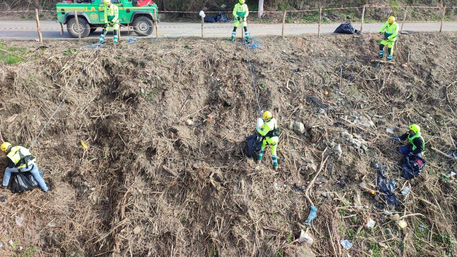 Intervento con imbracature e corde in un punto scosceso dove sono stati gettati ripetutamente sacchi pieni di plastica monouso