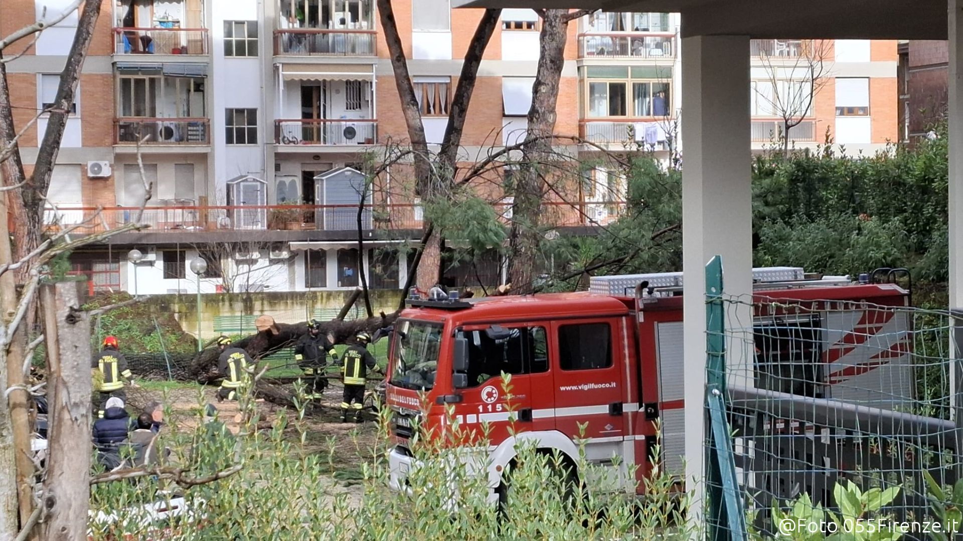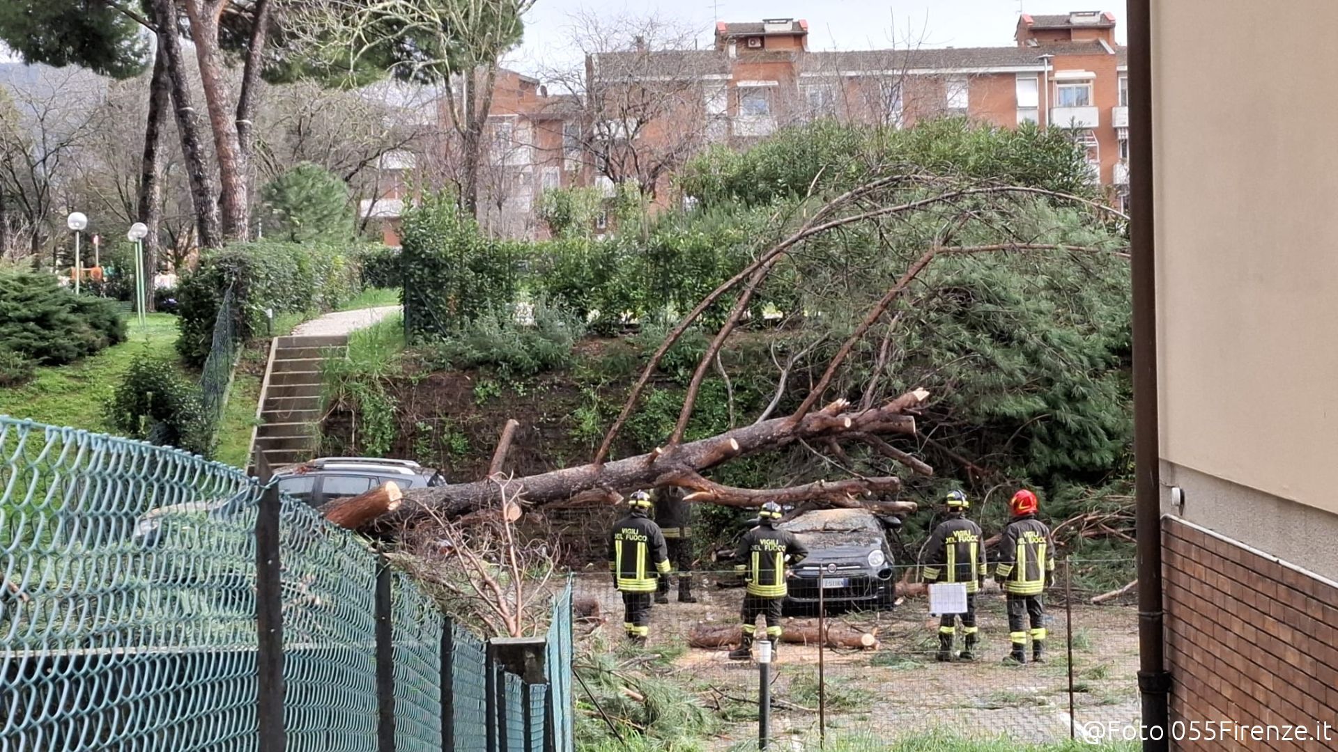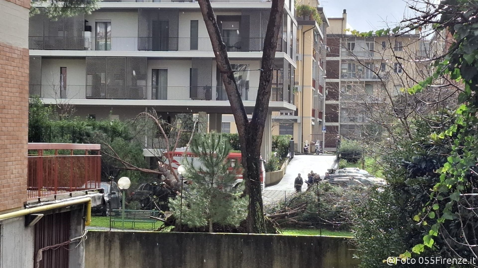 Un alto pino è infatti caduto all'interno di un parcheggio privato di un condominio, tra via Novelli, via della Rondinella e via Pio Rajna.