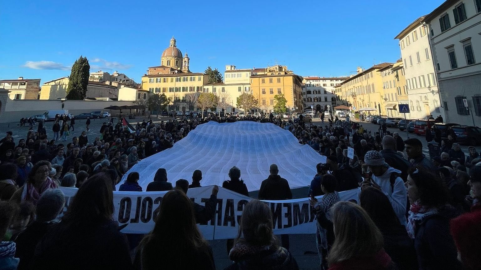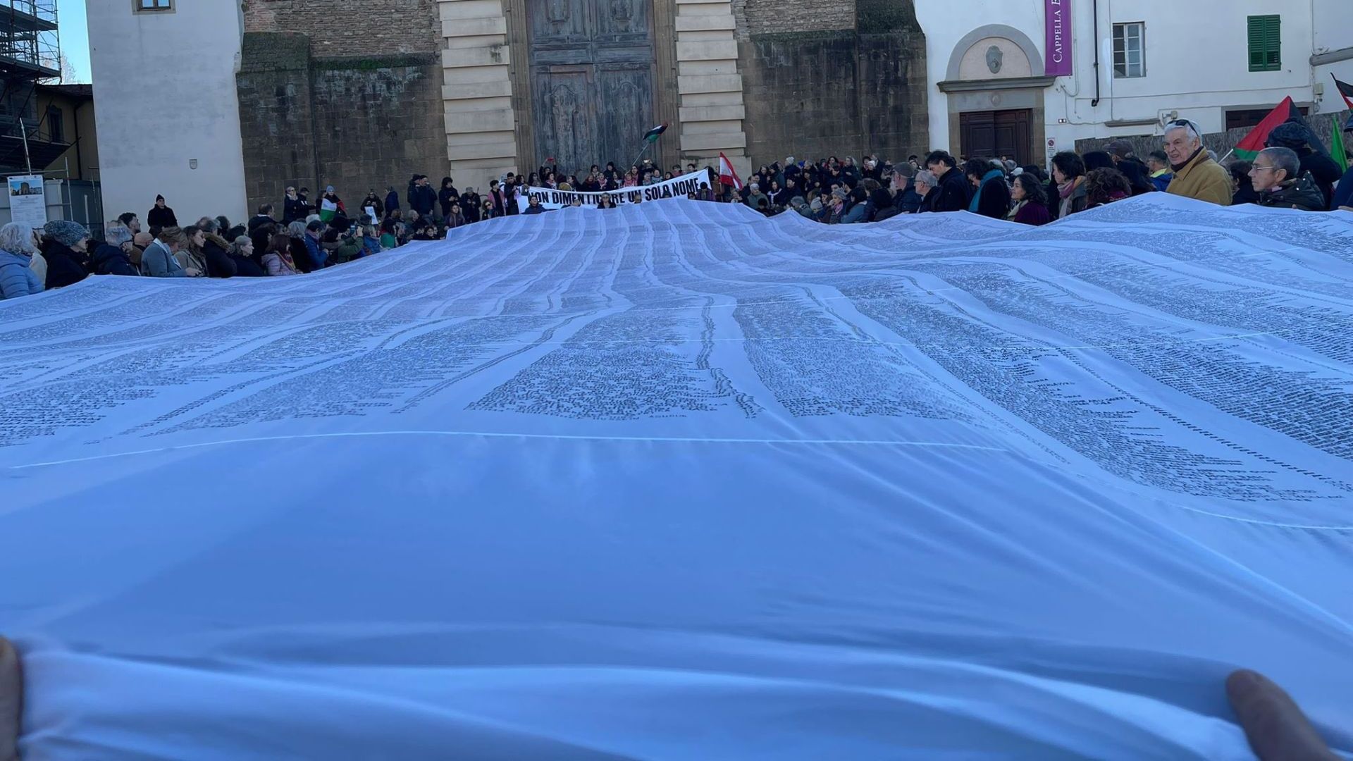 17.395 nomi. Sono i nomi dei bambini e minori uccisi a Gaza, scritti su un grande “sudario” bianco esposto domenica in piazza del Carmine a Firenze.