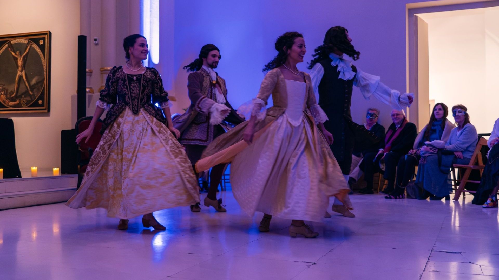 Tra gli specchi della preziosa Sala Luca Giordano, i ballerini della compagnia offriranno coreografie storiche del Rinascimento e del Barocco. In quell'atmosfera elegante, intima e festosa, la musica di Vivaldi, Lully o Falconeri avvolgerà i partecipanti e segnerà i passi dei danzatori mascherati che, accompagnati da un maestro di cerimonie e da un quartetto d'archi, guideranno gli ospiti lungo questa rappresentazione scenica.