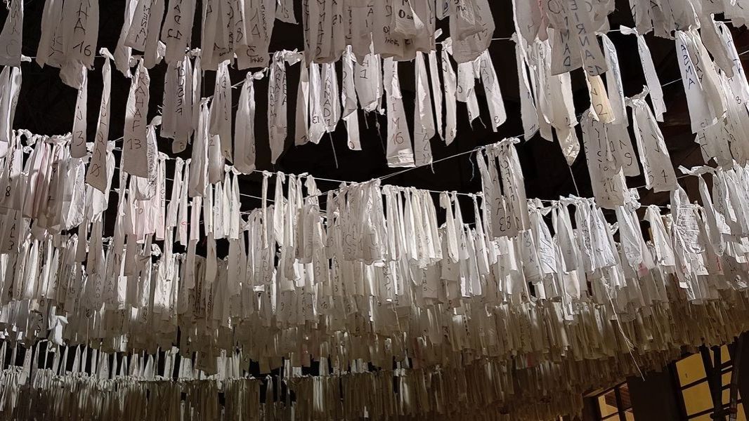 L’opera è composta da 19.104 strisce, ognuna con il nome e l’età dei bambini e delle bambine uccisi a Gaza. Un numero che prende forma visivamente nello spazio del giardino, trasformandosi in un colpo d’occhio potente e silenzioso.