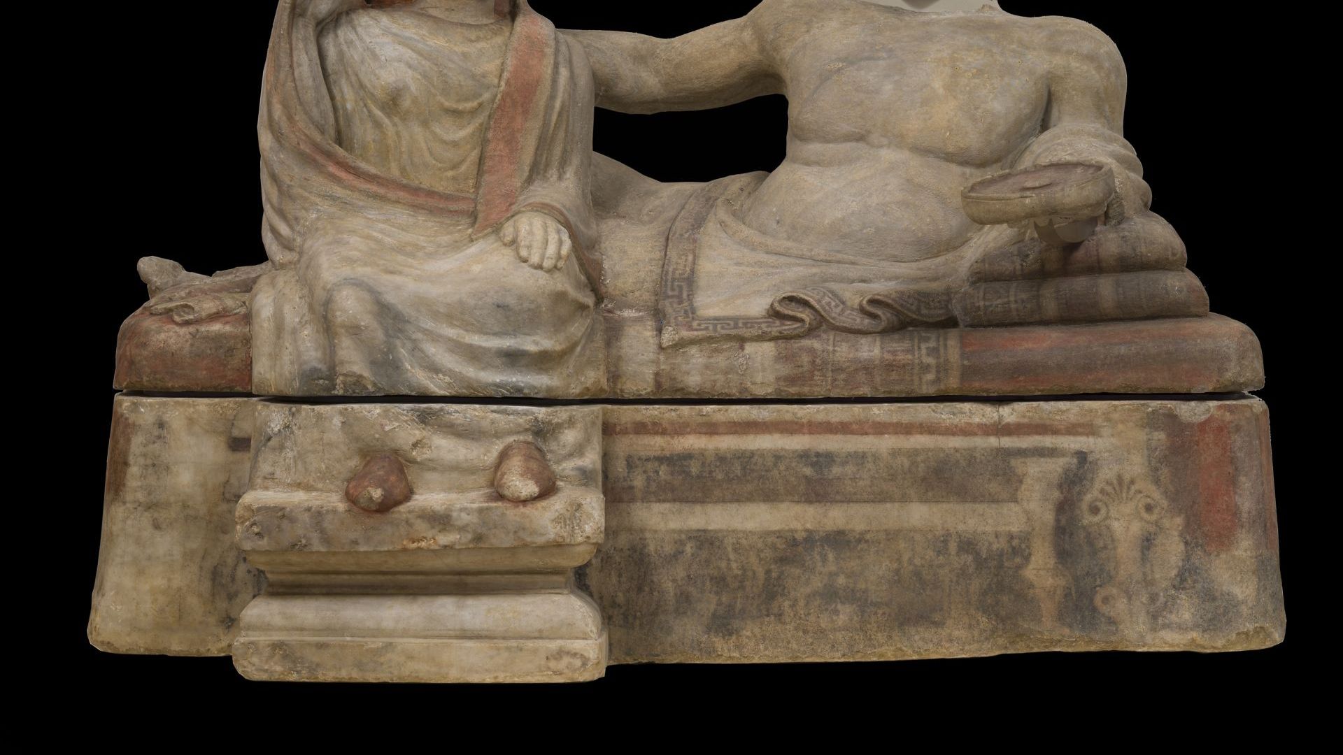 Il coperchio scolpito rappresenta una coppia di marito e moglie, un fatto unico nel panorama della scultura funeraria chiusina dell’epoca, che di regola vede il defunto accompagnato da un demone femminile con le ali “qui la donna è la moglie, è il gesto dello svelamento che ce lo conferma” sostiene Barbara Arbeid, Funzionaria Archeologa – Curatrice della Sezione Etrusca evidenziando l’eccezionalità iconografica dell’opera e la forza espressiva di quell’abbraccio.