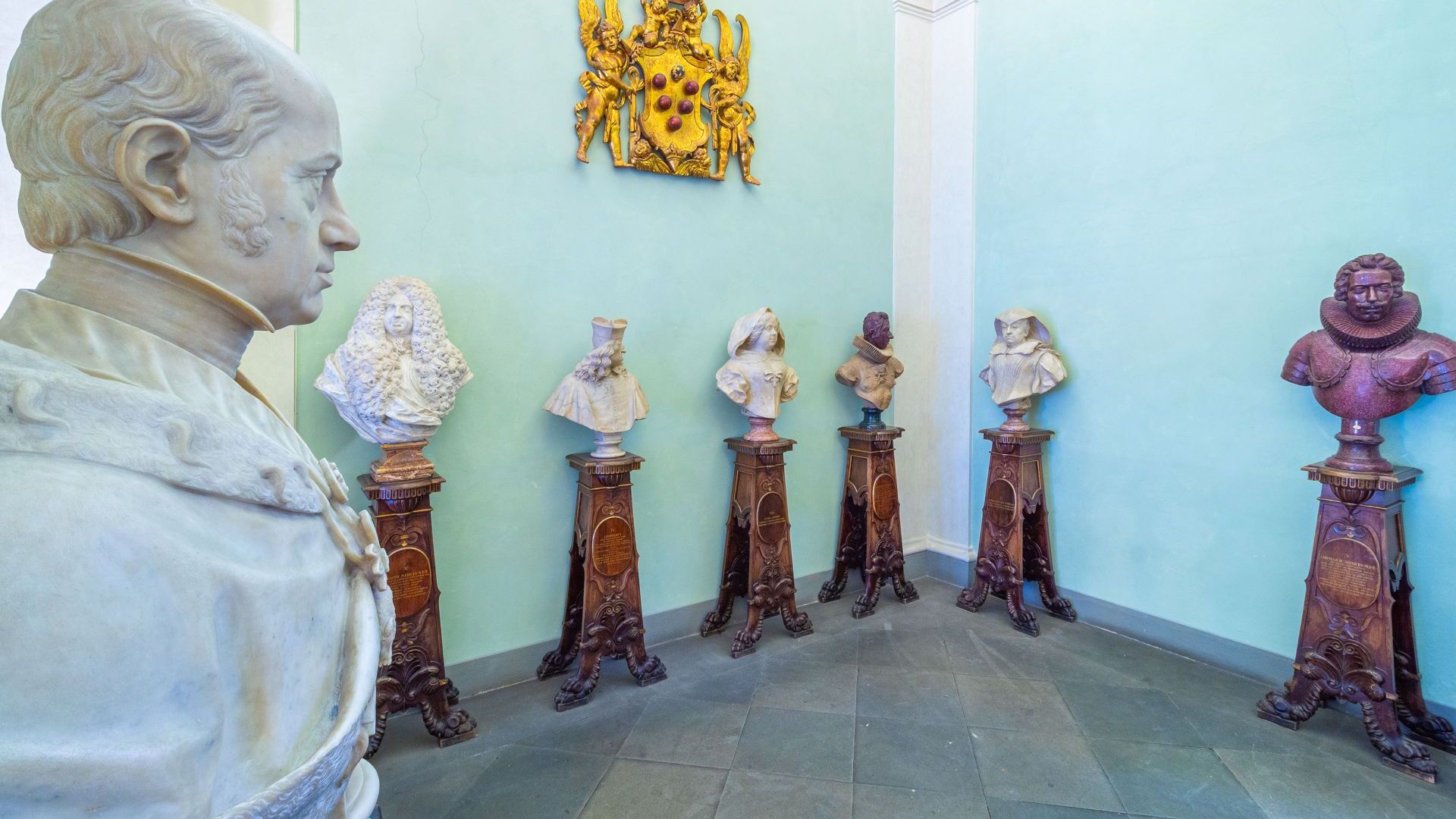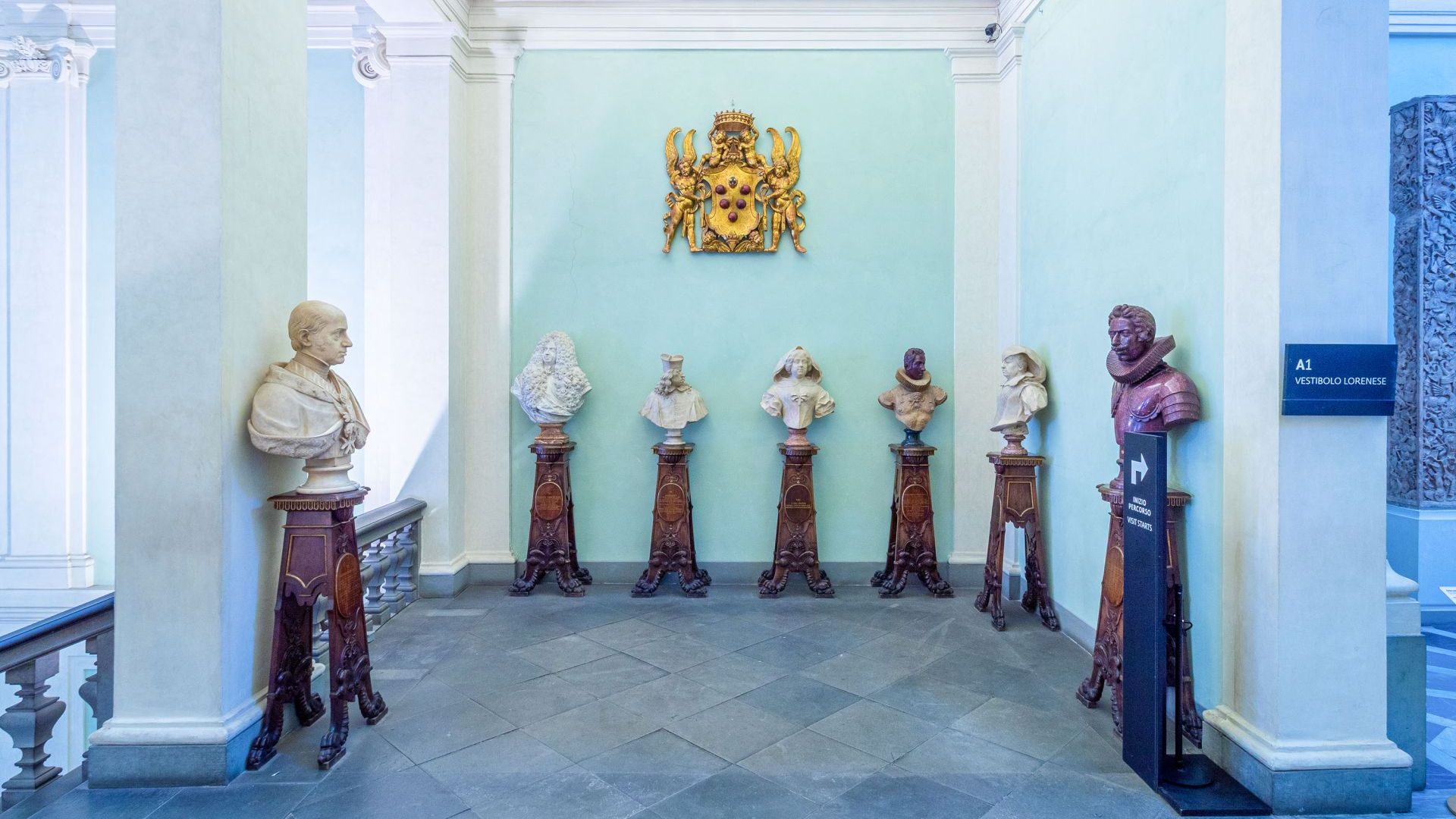 A salutare i “forestieri”, come si diceva nel Settecento, si trovano, in cima allo scalone, appena riallestiti, anche i volti dei predecessori alla guida del Granducato, i Medici, che avevano fondato e accresciuto la Galleria, da Cosimo I all’ultimo, Giangastone. Pure per ognuno di loro Lanzi aveva composto iscrizioni latine a futura memoria, rendendo omaggio in particolare ai loro meriti ed imprese collezionistiche, fondamentali per la costruzione dello sterminato patrimonio d’arte degli Uffizi. Ora, nelle loro sontuose parrucche, i busti sono posti su massicci sgabelloni lignei. E, anch’esso ligneo, il grande stemma ligneo policromo di Baccio d’Agnolo domina dall’alto della parete la parata marmorea.