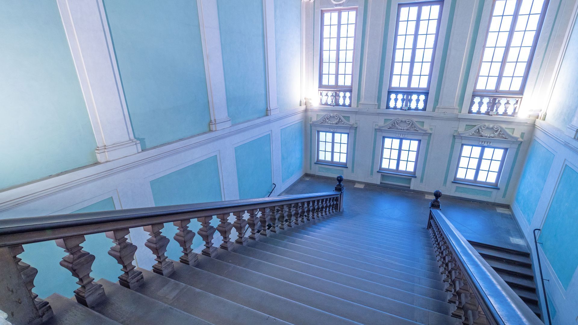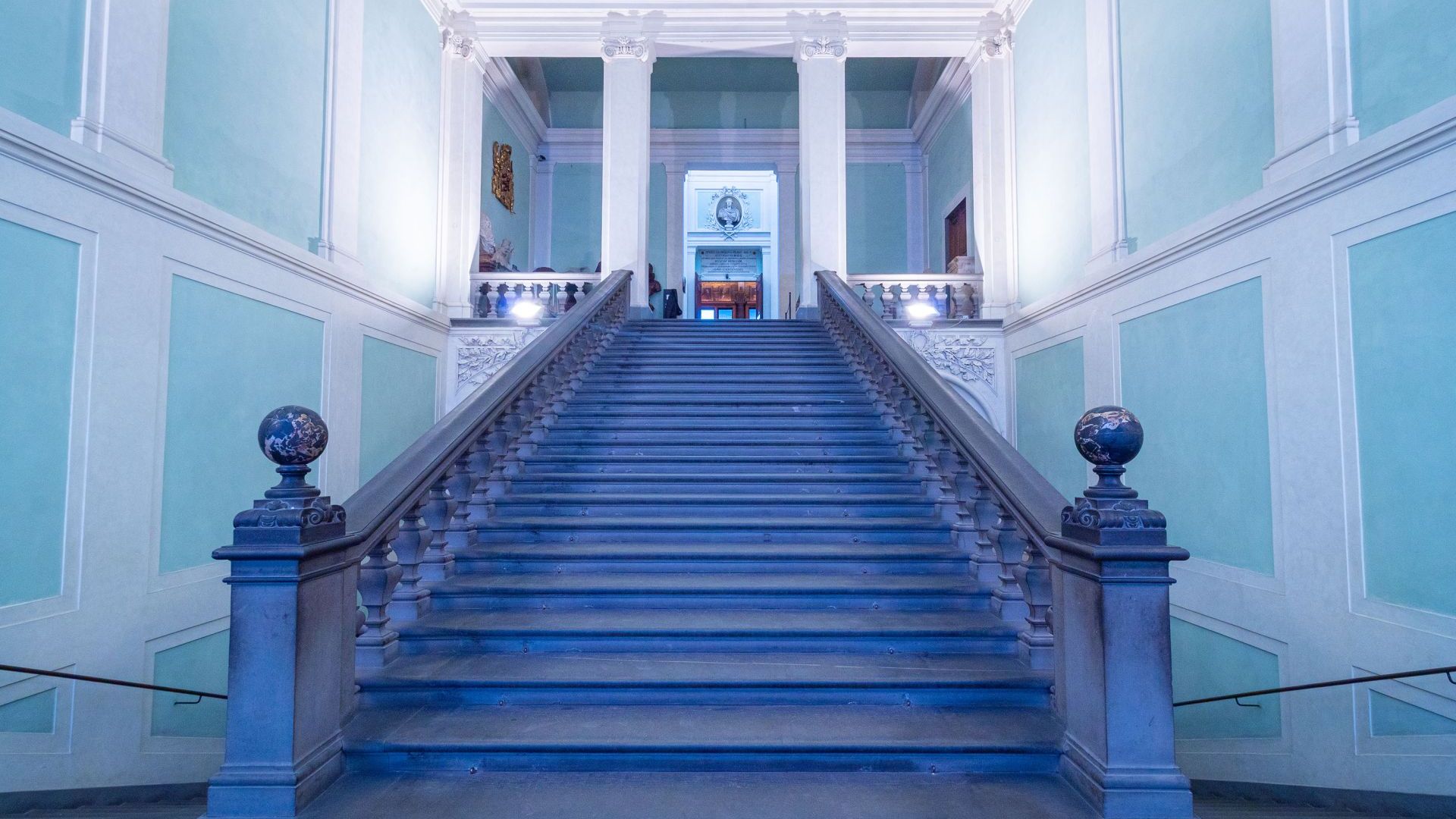L’intero scalone era stato restaurato fra il 2005 e il 2007 nella parte degli intonaci, degli stucchi e degli apparati decorativi. La tinteggiatura delle pareti ‘verde Lorena’ fu realizzata sulla base di una serie di saggi che riportarono in luce il colore scelto dai Granduchi lorenesi impiegati anche in altri luoghi su cui la dinastia granducale intervenne: Poggio Imperiale, Specola, Kaffeehaus, nonché la Limonaia di Boboli. La particolare coloritura che i documenti storici definiscono “verdognolo con terra verde, verderami ed altro” è in linea con quanto si faceva nell’impero austro-ungarico, seguendo i dettami di un elaborato Rococò.
