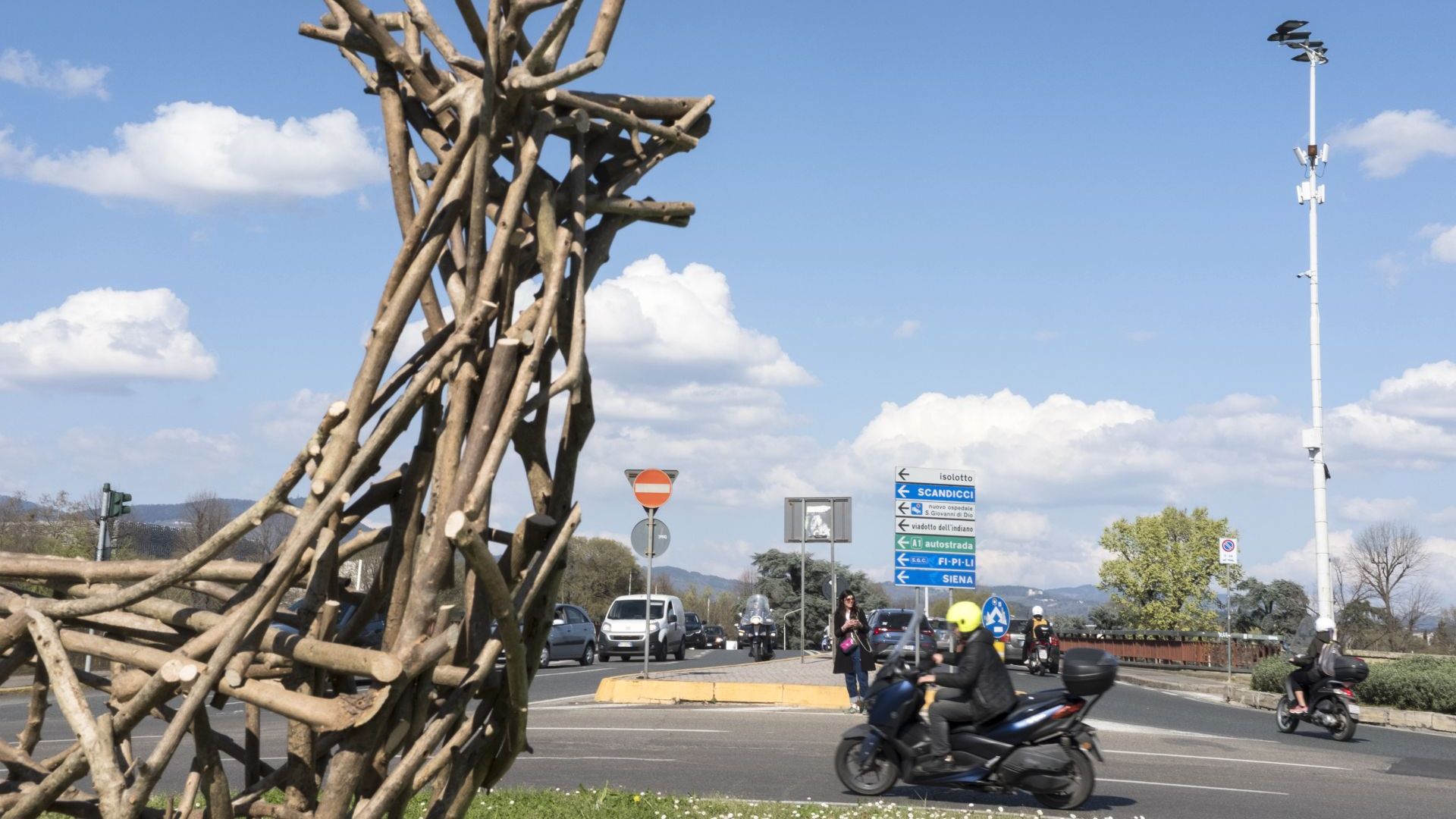 Al centro della rotonda prima del Ponte della Vittoria, in mezzo al traffico cittadino, riecco il cervo che originariamente era stato costruito lungo l’argine del fiume sotto ponte alla Vittoria con legno di risulta.