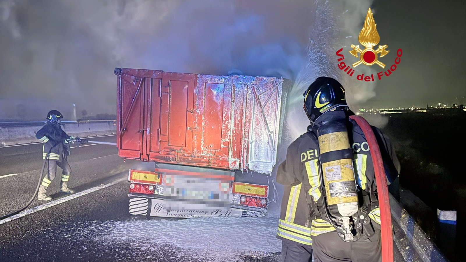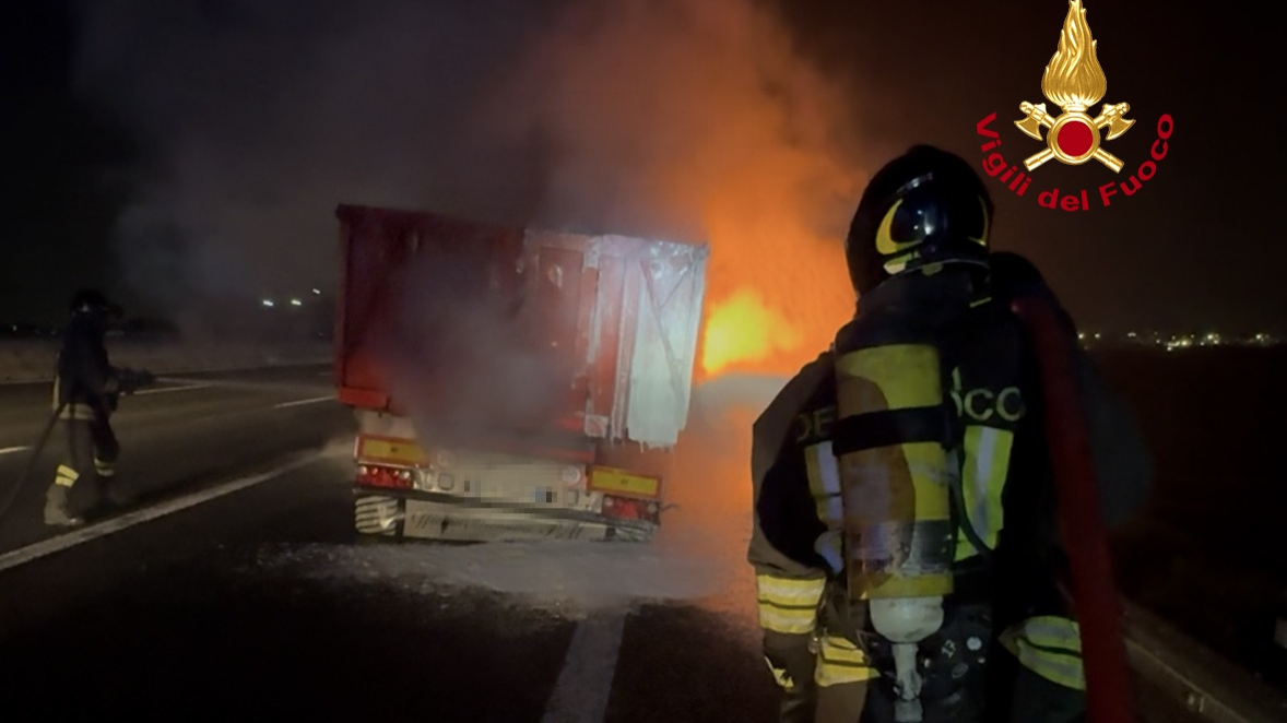 L'incendio sarebbe stato dovuto allo scoppio di uno pneumatico che ha fatto sbandare il rimorchio surriscaldando il cassone. Le operazioni sono terminate alle ore 6.