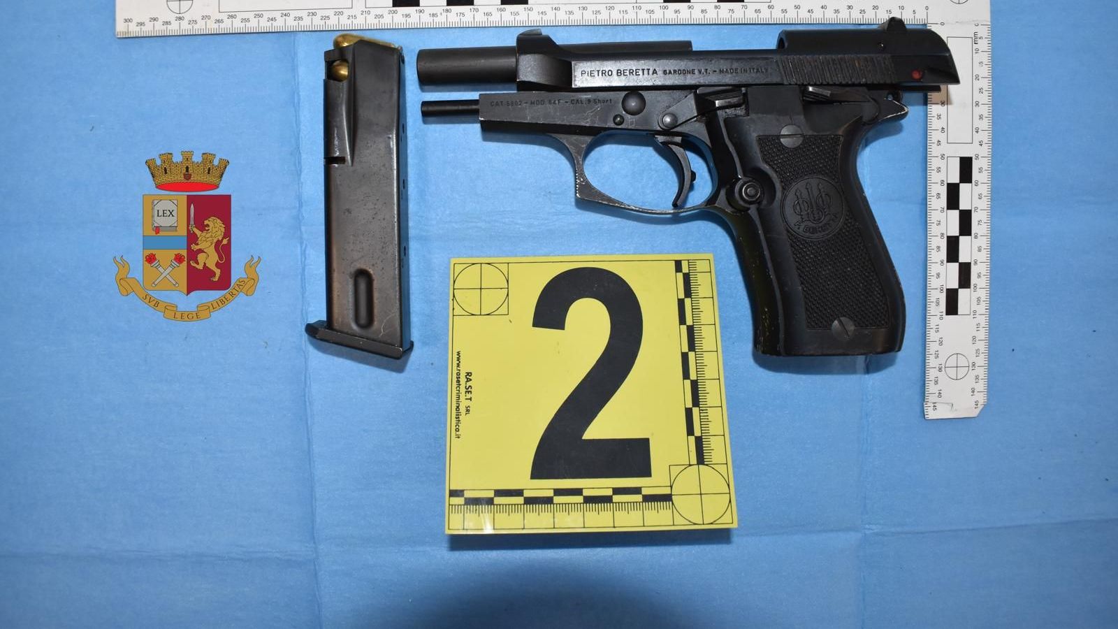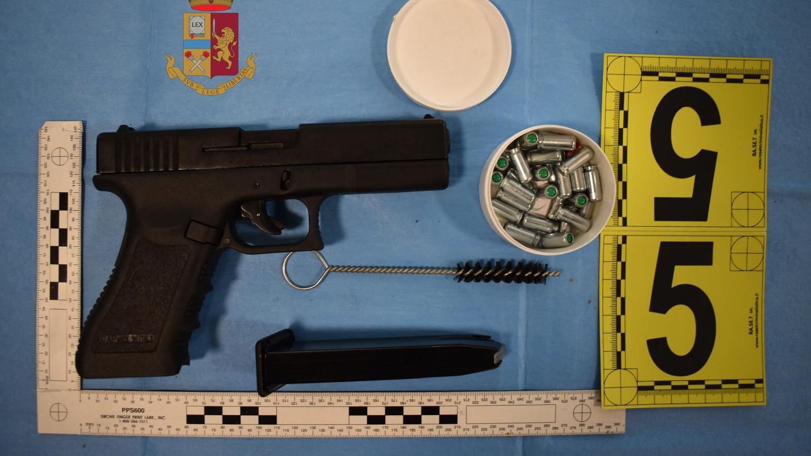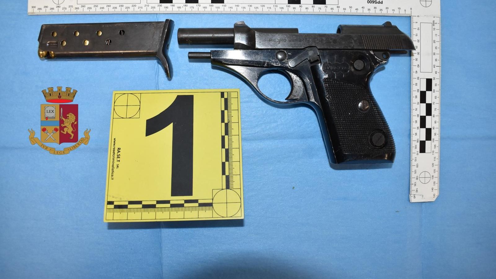 In particolare, sono state rinvenute cinque armi comuni da sparo e: una pistola marca Beretta, modello 70, calibro 7.65, comprensiva di caricatore monofilare inserito contenente sei cartucce del medesimo calibro; una pistola marca Beretta, correlata di caricatore difilare inserito contenente almeno 13 cartucce, compendio di furto in abitazione perpetrato nel 2021 a Quarrata (PT); una pistola scacciacani replica Beretta PX4 Storm modificata con sostituzione canna originaria con canna in acciaio, correlata di caricatore privo di cartucce, priva di dati identificativi e dunque arma clandestina; una pistola da tasca tipo revolver, munita di tamburo con andamento destrorso con cinque camere di cartuccia, con inserite cinque cartucce; una pistola a salve marca Bruni, con caricatore inserito e privo di cartucce, contenuta all'interno della propria scatola, corredata di trenta colpi.